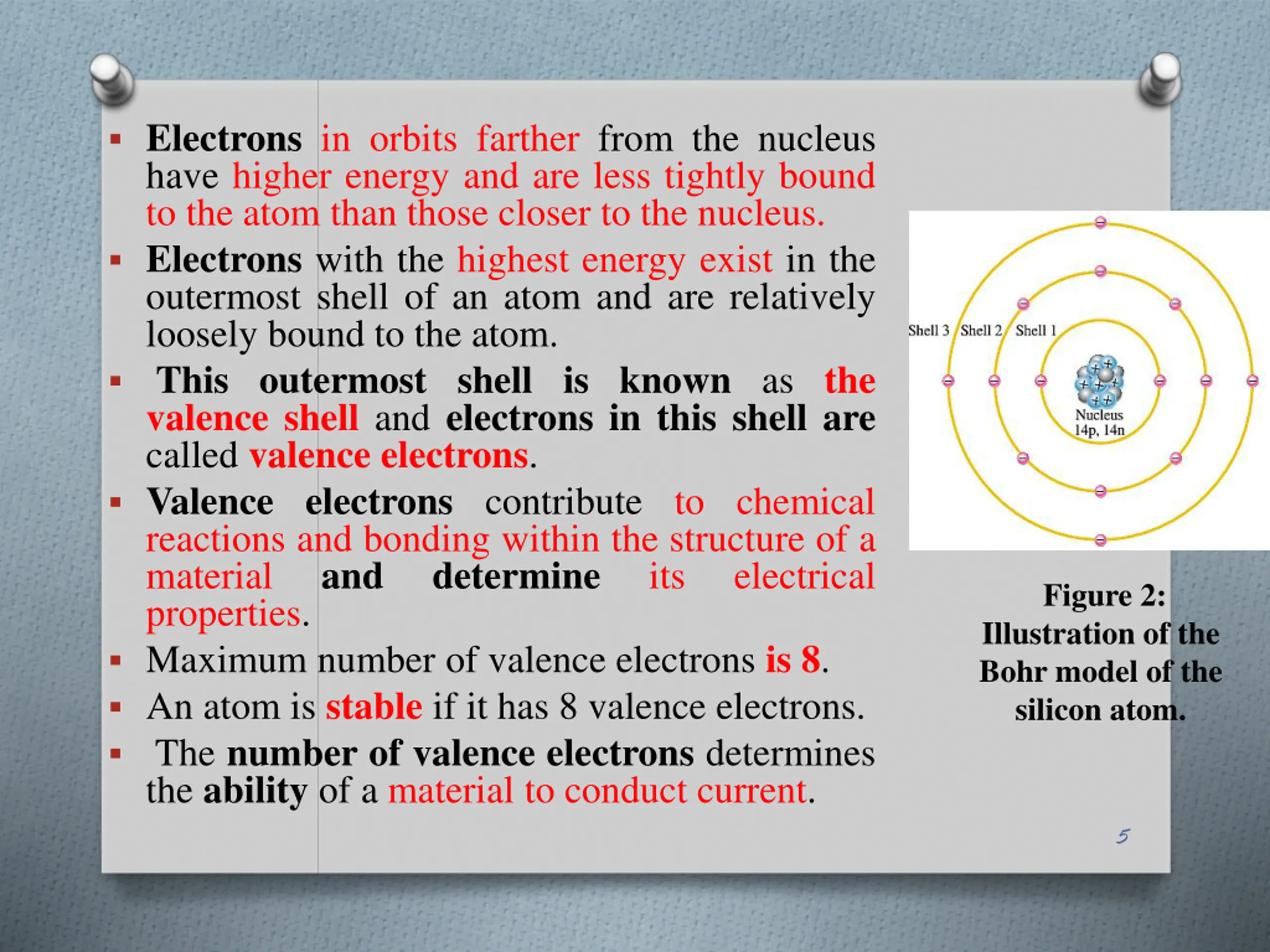 Electrons in orbits farther from the nucleus have higher energy and are less tightly bound to the atom than those closer to the nucleus. Electrons with the highest energy exist in the outermost shell of an atom and are relatively loosely bound to the atom. This outermost shell is known as the valence shell and electrons in this shell are called valence electrons. Valence electrons contribute to chemical reactions and bonding within the structure of a material and determine properties. Maximum number of valence electrons is 8. An atom is stable if it has 8 valence electrons. The number of valence electrons determines the ability of a material to conduct current. its electrical Figure 2: Illustration of the Bohr model of the silicon atom. 5