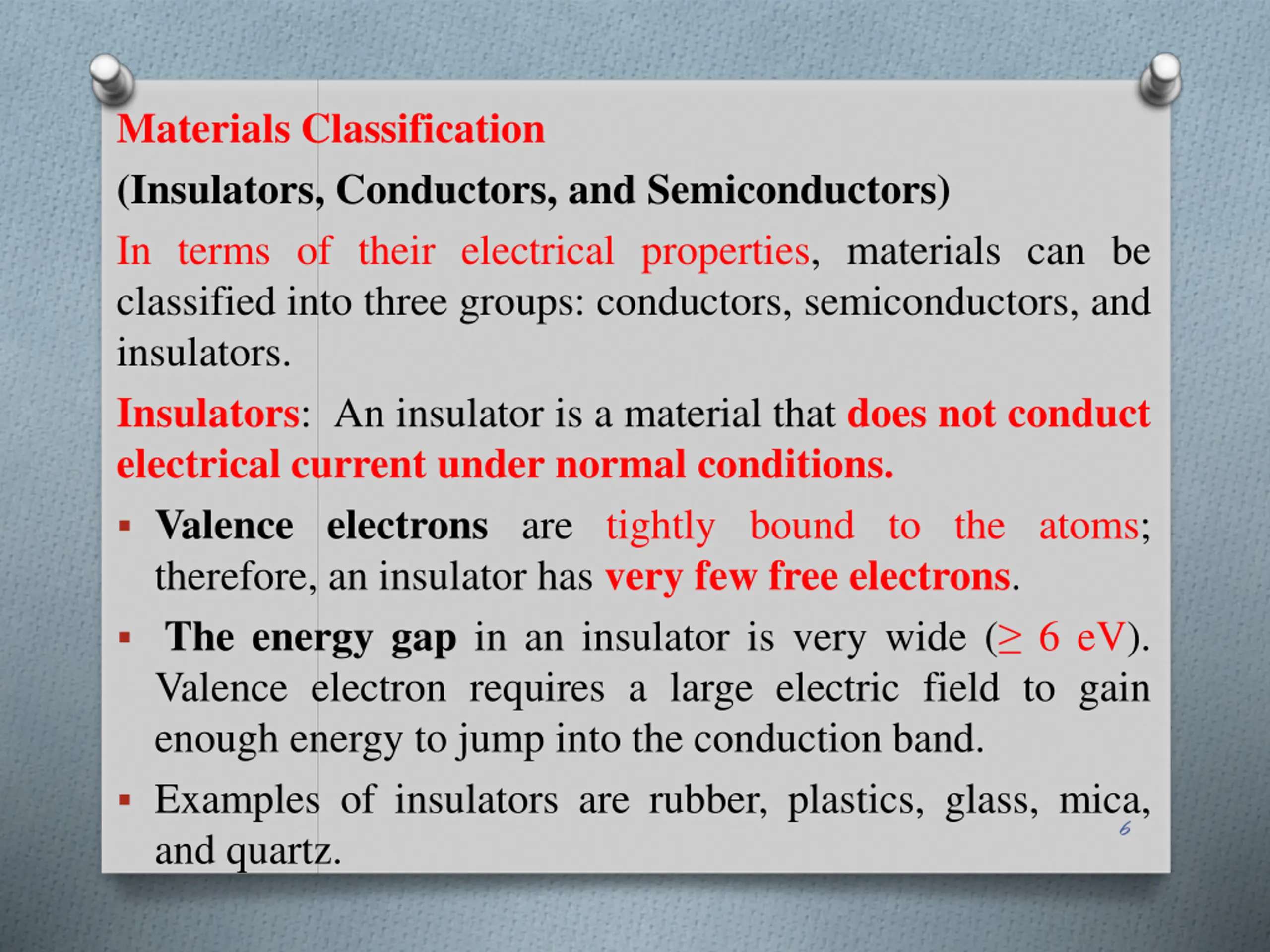 Materials Classification (Insulators, Conductors, and Semiconductors) In terms of their electrical properties, materials can be classified into three groups: conductors, semiconductors, and insulators. Insulators: An insulator is a material that does not conduct electrical current under normal conditions. Valence electrons are tightly bound to the atoms; therefore, an insulator has very few free electrons. The energy gap in an insulator is very wide ( 6 eV). Valence electron requires a large electric field to gain enough energy to jump into the conduction band. Examples of insulators are rubber, plastics, glass, mica, and quartz. 6