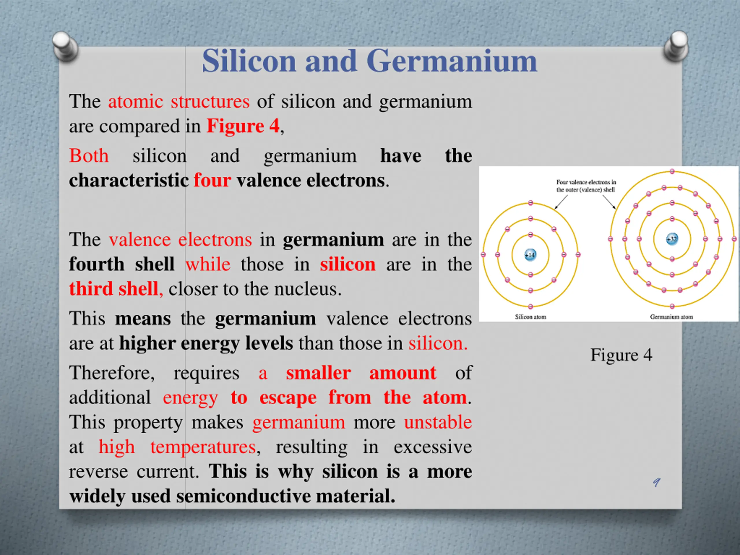 Silicon and Germanium The atomic structures of silicon and germanium are compared in Figure 4, Both silicon and germanium have the characteristic four valence electrons. The valence electrons in germanium are in the fourth shell while those in silicon are in the third shell, closer to the nucleus. This means the germanium valence electrons are at higher energy levels than those in silicon. Therefore, requires a smaller amount of additional energy to escape from the atom. This property makes germanium more unstable at high temperatures, resulting in excessive reverse current. This is why silicon is a more widely used semiconductive material. Figure 4 9