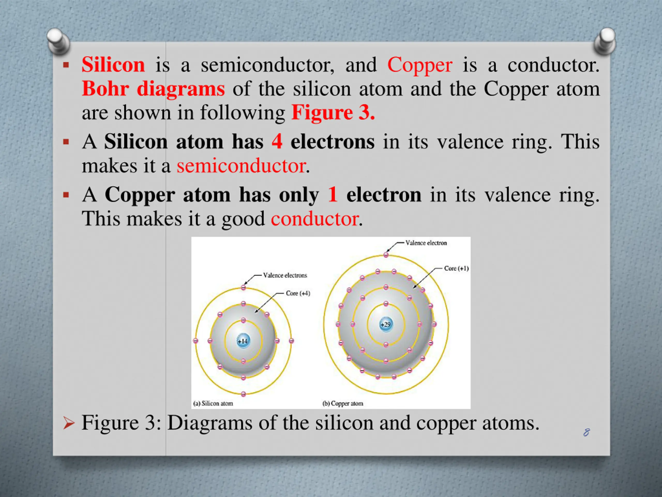 Silicon is a semiconductor, and Copper is a conductor. Bohrdiagrams of the silicon atom and the Copper atom are shown in following Figure 3. A Silicon atom has 4 electrons in its valence ring. This makes it a semiconductor. A Copper atom has only 1 electron in its valence ring. This makes it a good conductor. Figure 3: Diagrams of the silicon and copper atoms. 8