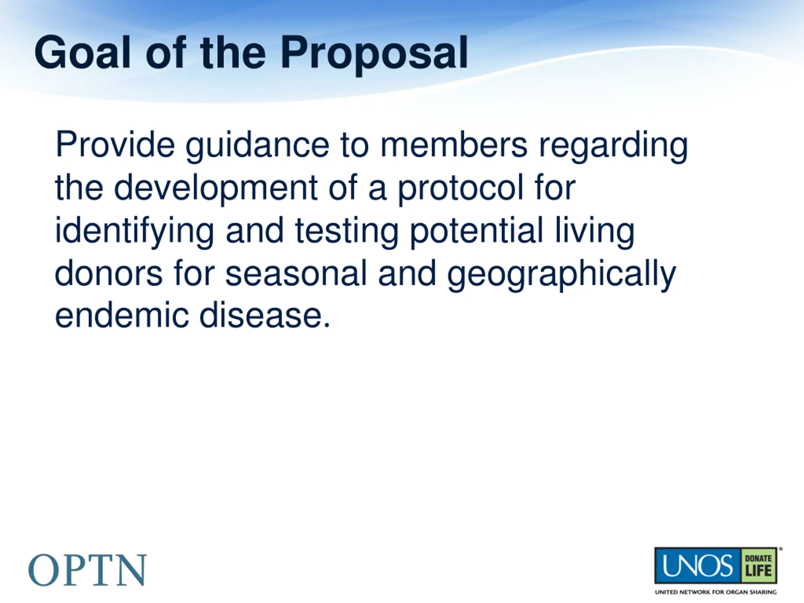Goal of the Proposal Provide guidance to members regarding the development of a protocol for identifying and testing potential living donors for seasonal and geographically endemic disease.