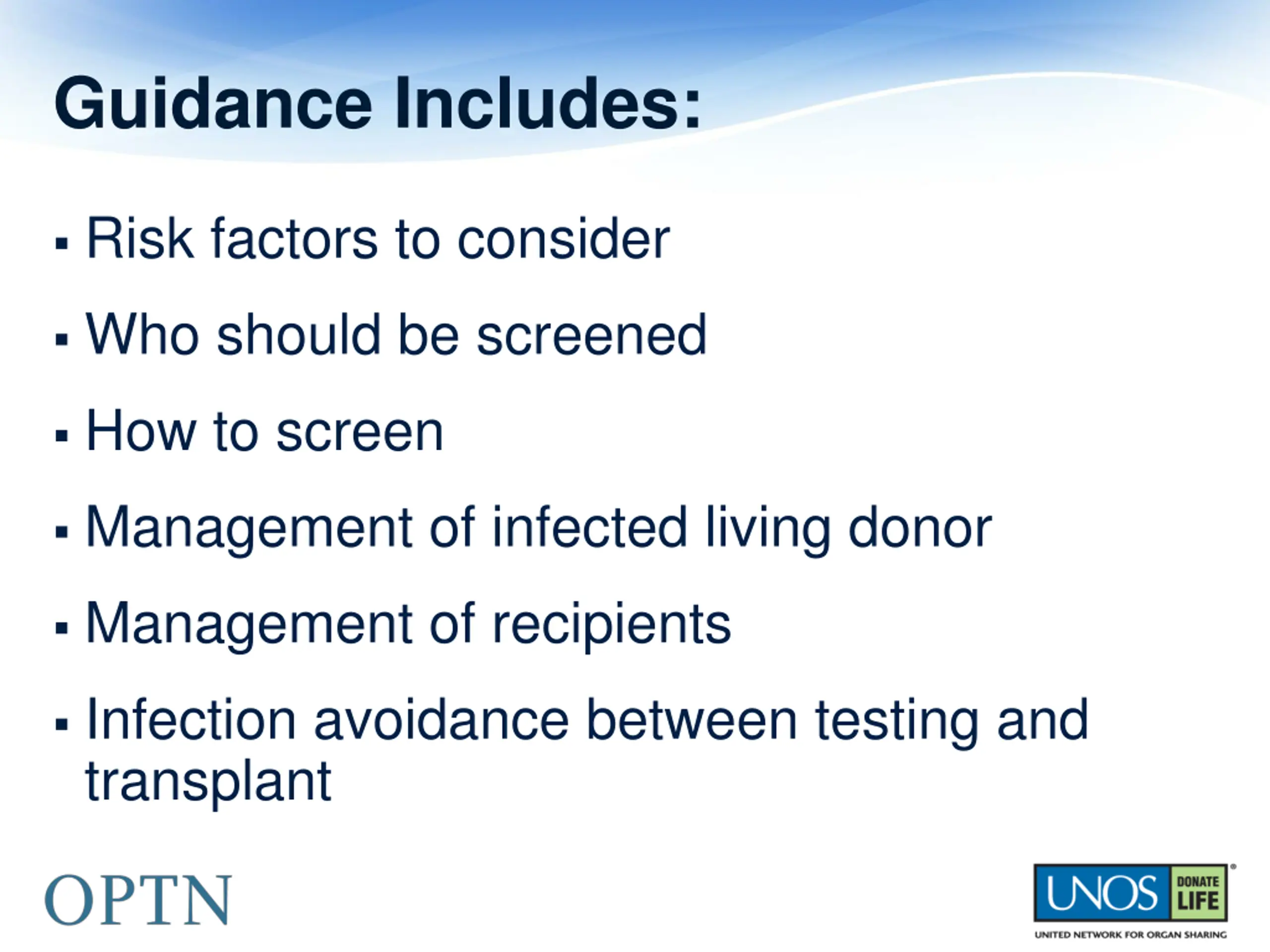 Guidance Includes: Risk factors to consider Who should be screened How to screen Management of infected living donor Management of recipients Infection avoidance between testing and transplant
