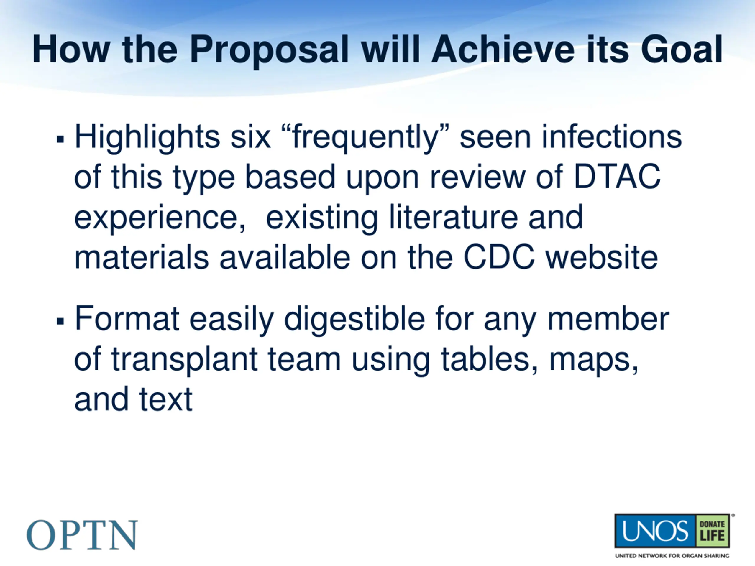 How the Proposal will Achieve its Goal Highlights six frequently seen infections of this type based upon review of DTAC experience, existing literature and materials available on the CDC website Format easily digestible for any member of transplant team using tables, maps, and text
