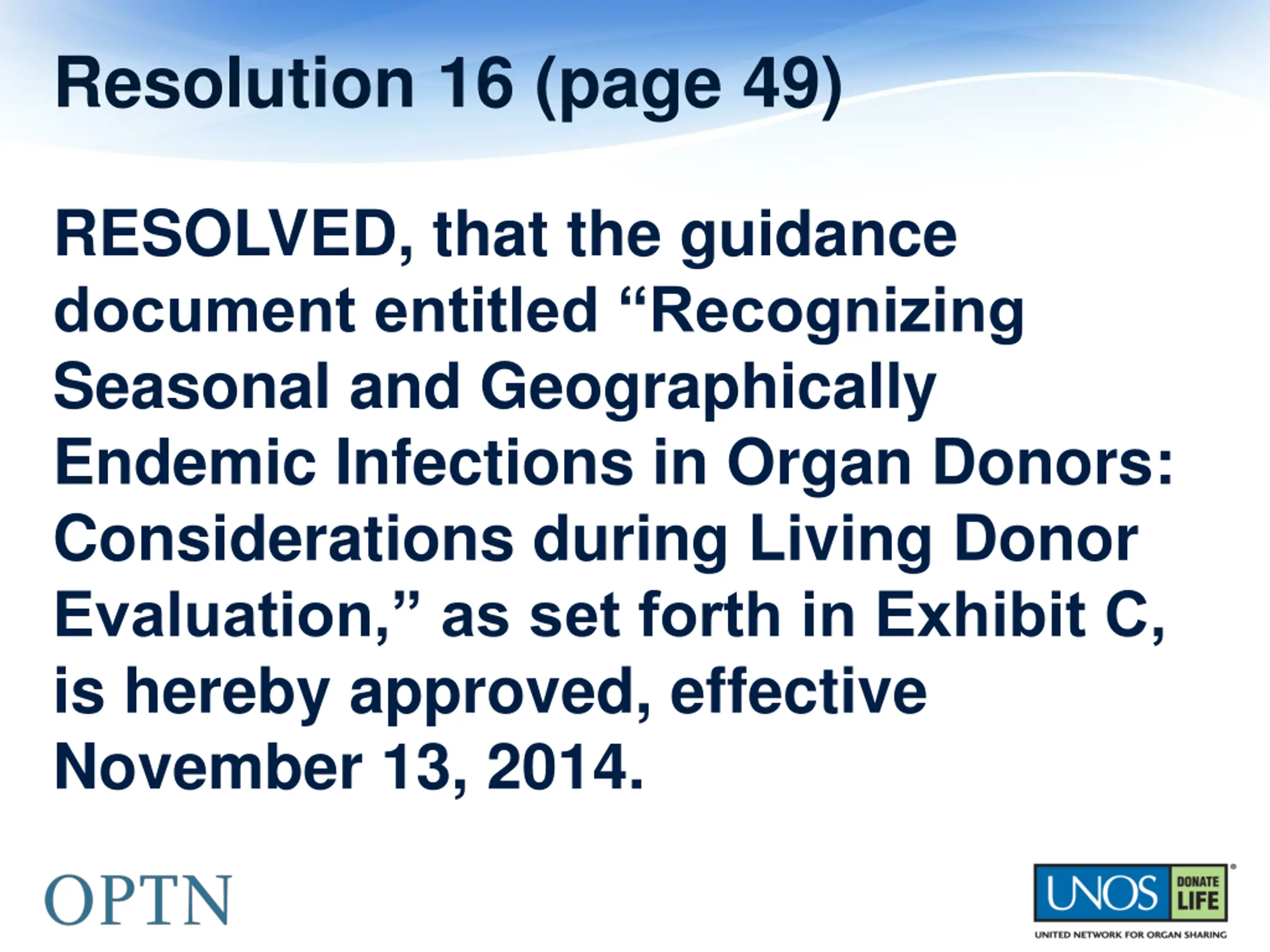 Resolution 16 (page 49) RESOLVED, that the guidance document entitled Recognizing Seasonal and Geographically Endemic Infections in Organ Donors: Considerations during Living Donor Evaluation, as set forth in Exhibit C, is hereby approved, effective November 13, 2014.
