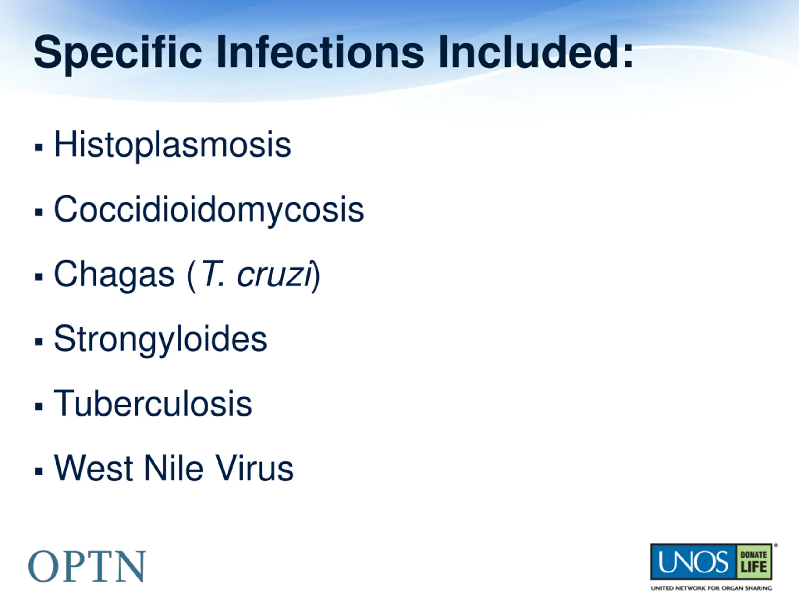 Specific Infections Included: Histoplasmosis Coccidioidomycosis Chagas (T. cruzi) Strongyloides Tuberculosis West Nile Virus