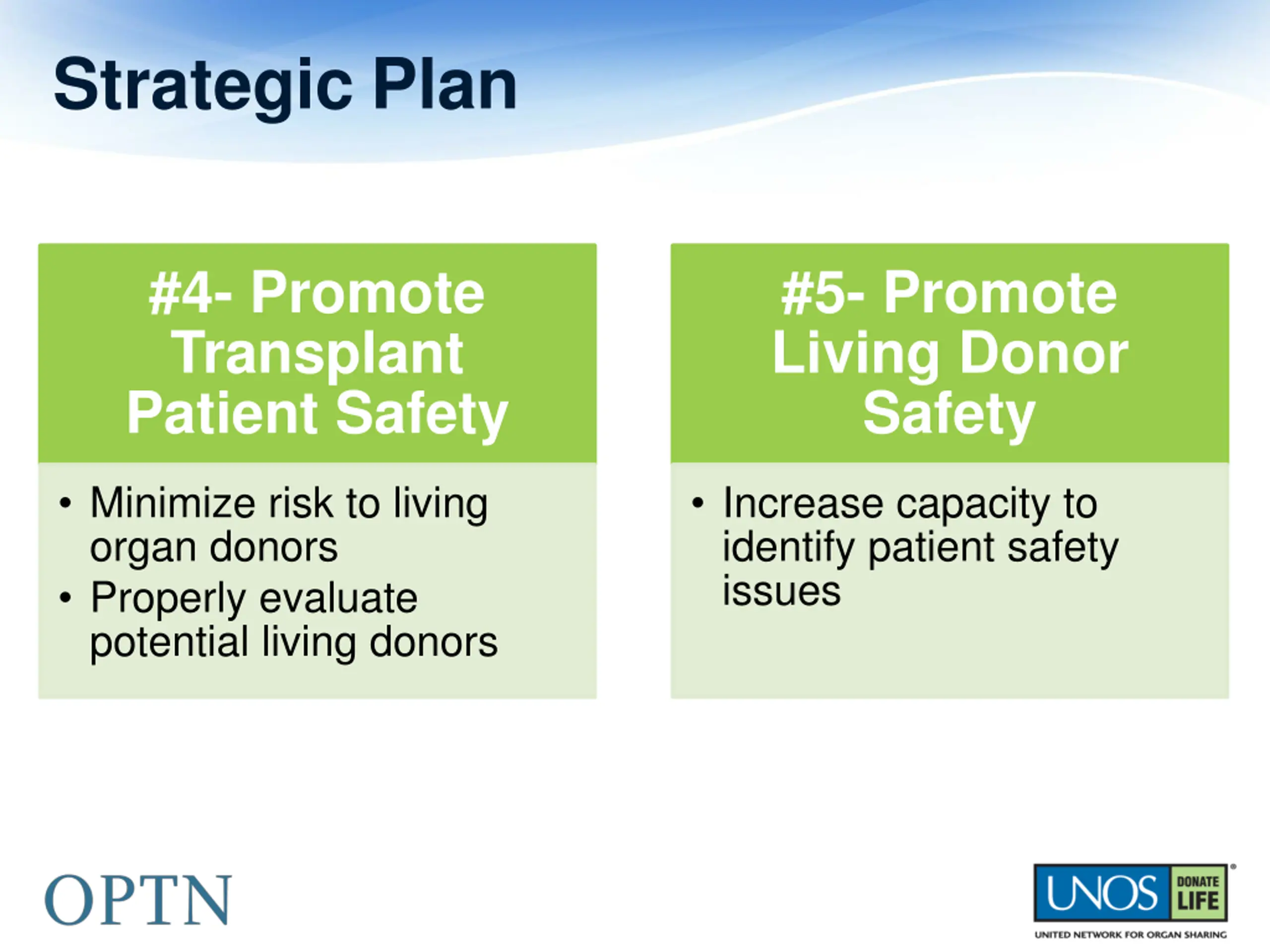 Strategic Plan #4- Promote Transplant Patient Safety #5- Promote Living Donor Safety Minimize risk to living organ donors Properly evaluate potential living donors Increase capacity to identify patient safety issues