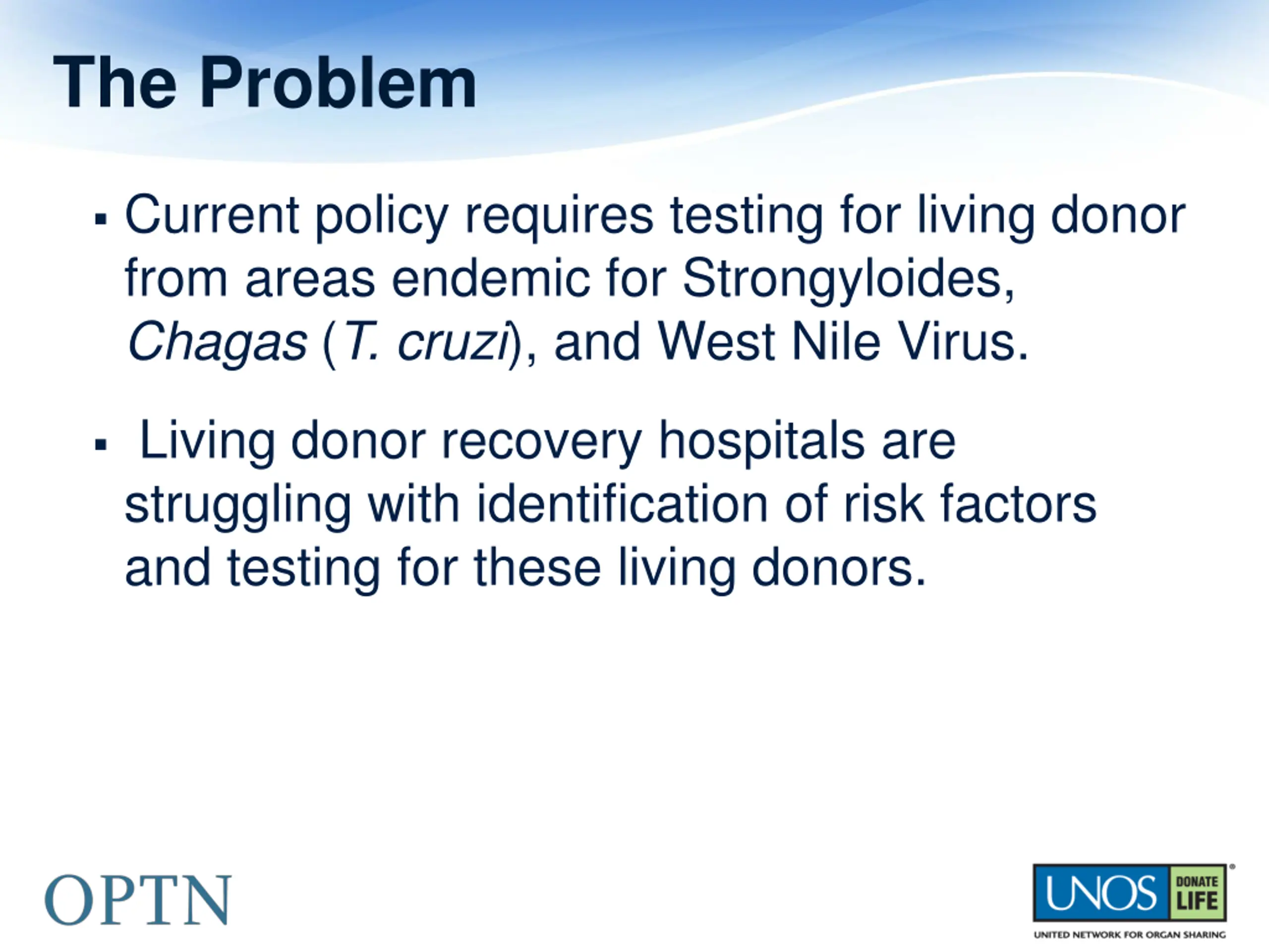 The Problem Current policy requires testing for living donor from areas endemic for Strongyloides, Chagas (T. cruzi), and West Nile Virus. Living donor recovery hospitals are struggling with identification of risk factors and testing for these living donors.