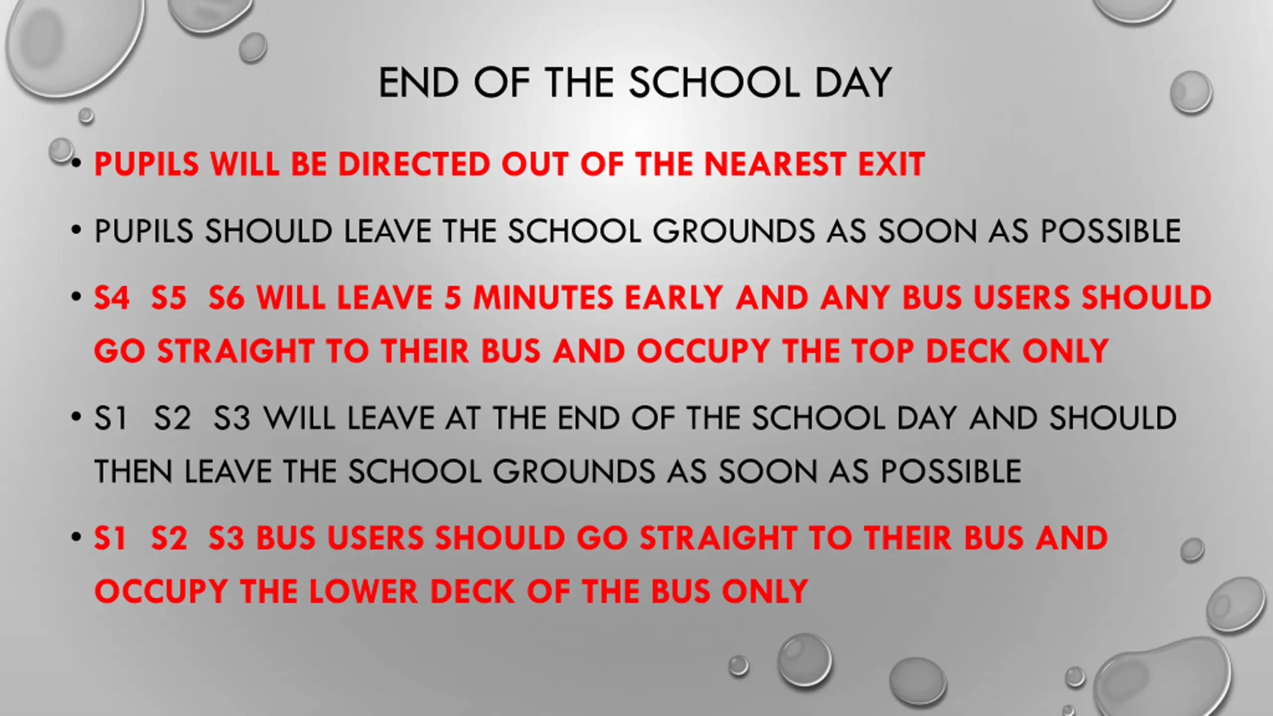 END OF THE SCHOOL DAY PUPILS WILL BE DIRECTED OUT OF THE NEAREST EXIT PUPILS SHOULD LEAVE THE SCHOOL GROUNDS AS SOON AS POSSIBLE S4 S5 S6 WILL LEAVE 5 MINUTES EARLY AND ANY BUS USERS SHOULD GO STRAIGHT TO THEIR BUS AND OCCUPY THE TOP DECK ONLY S1 S2 S3 WILL LEAVE AT THE END OF THE SCHOOL DAY AND SHOULD THEN LEAVE THE SCHOOL GROUNDS AS SOON AS POSSIBLE S1 S2 S3 BUS USERS SHOULD GO STRAIGHT TO THEIR BUS AND OCCUPY THE LOWER DECK OF THE BUS ONLY