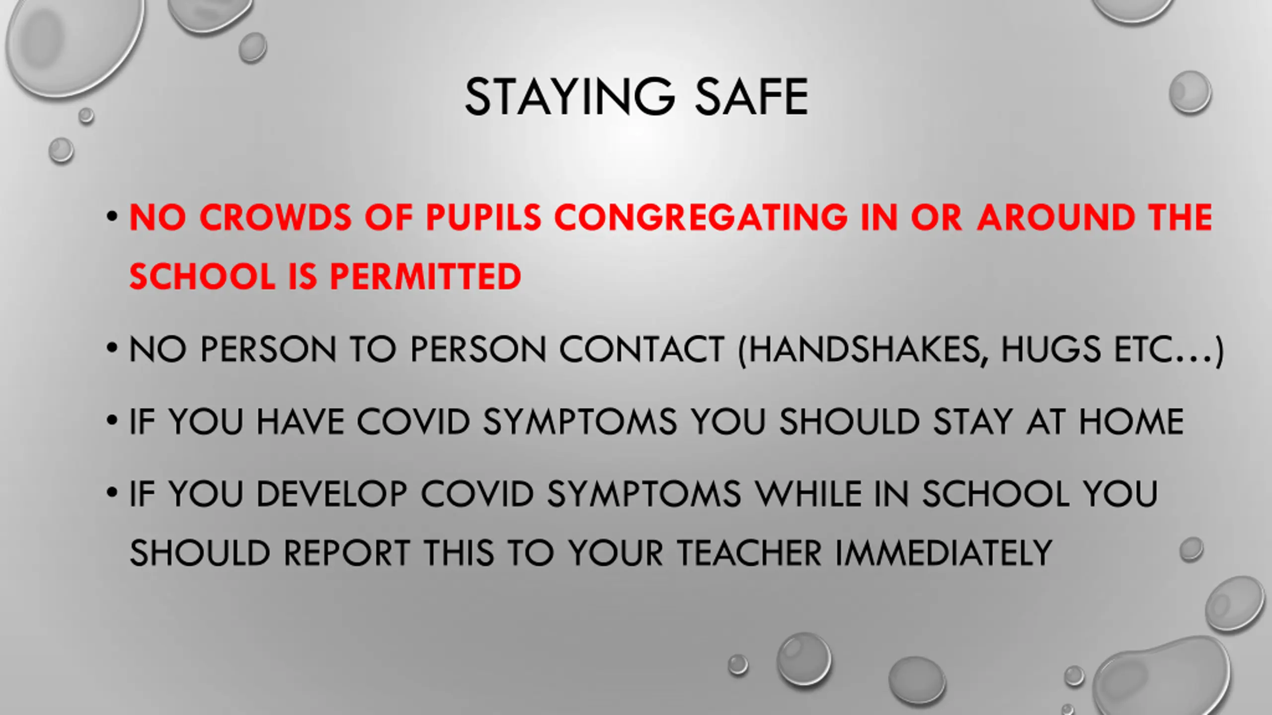 STAYING SAFE NO CROWDS OF PUPILS CONGREGATING IN OR AROUND THE SCHOOL IS PERMITTED NO PERSON TO PERSON CONTACT (HANDSHAKES, HUGS ETC ) IF YOU HAVE COVID SYMPTOMS YOU SHOULD STAY AT HOME IF YOU DEVELOP COVID SYMPTOMS WHILE IN SCHOOL YOU SHOULD REPORT THIS TO YOUR TEACHER IMMEDIATELY