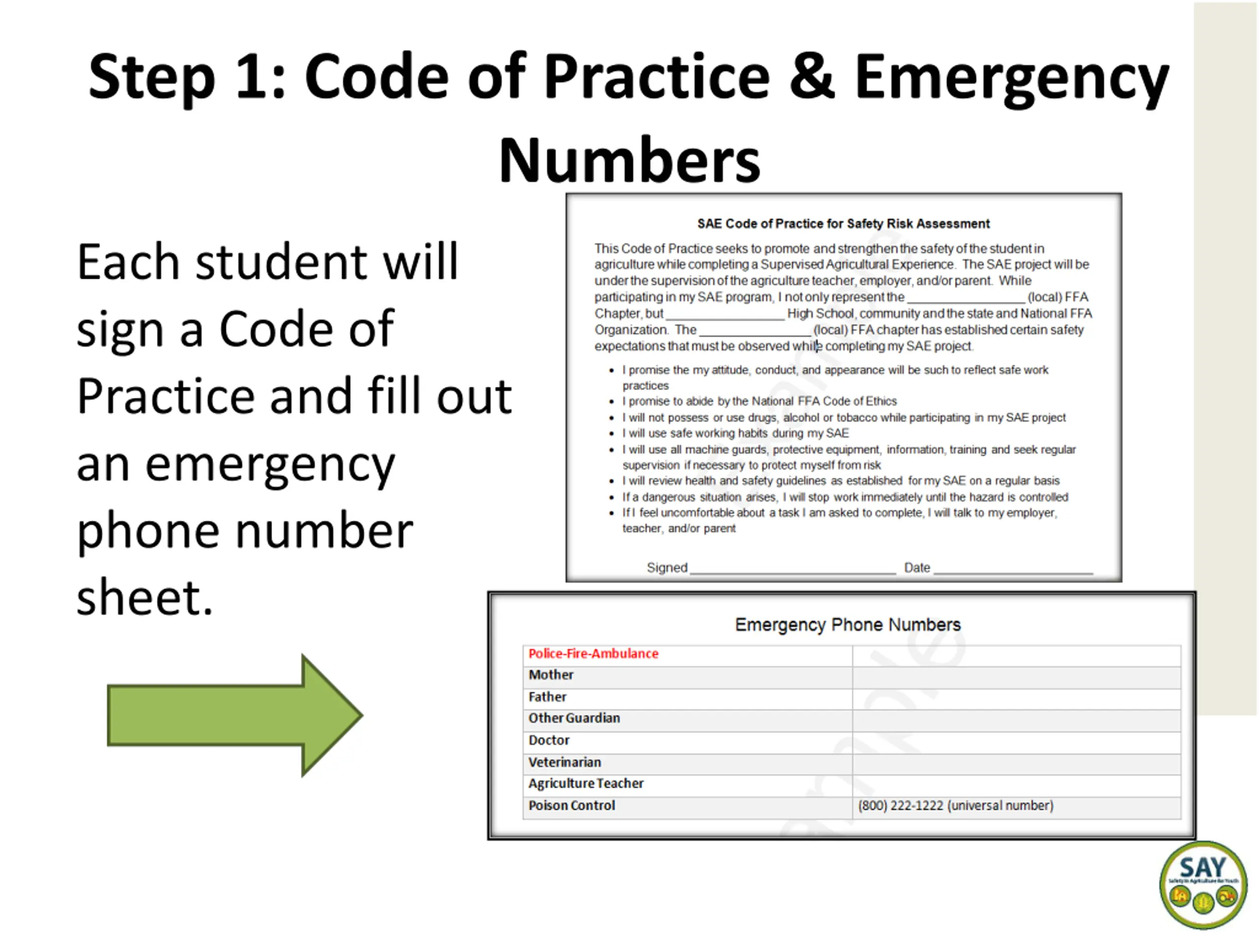 Step 1: Code of Practice & Emergency Numbers Each student will sign a Code of Practice and fill out an emergency phone number sheet.