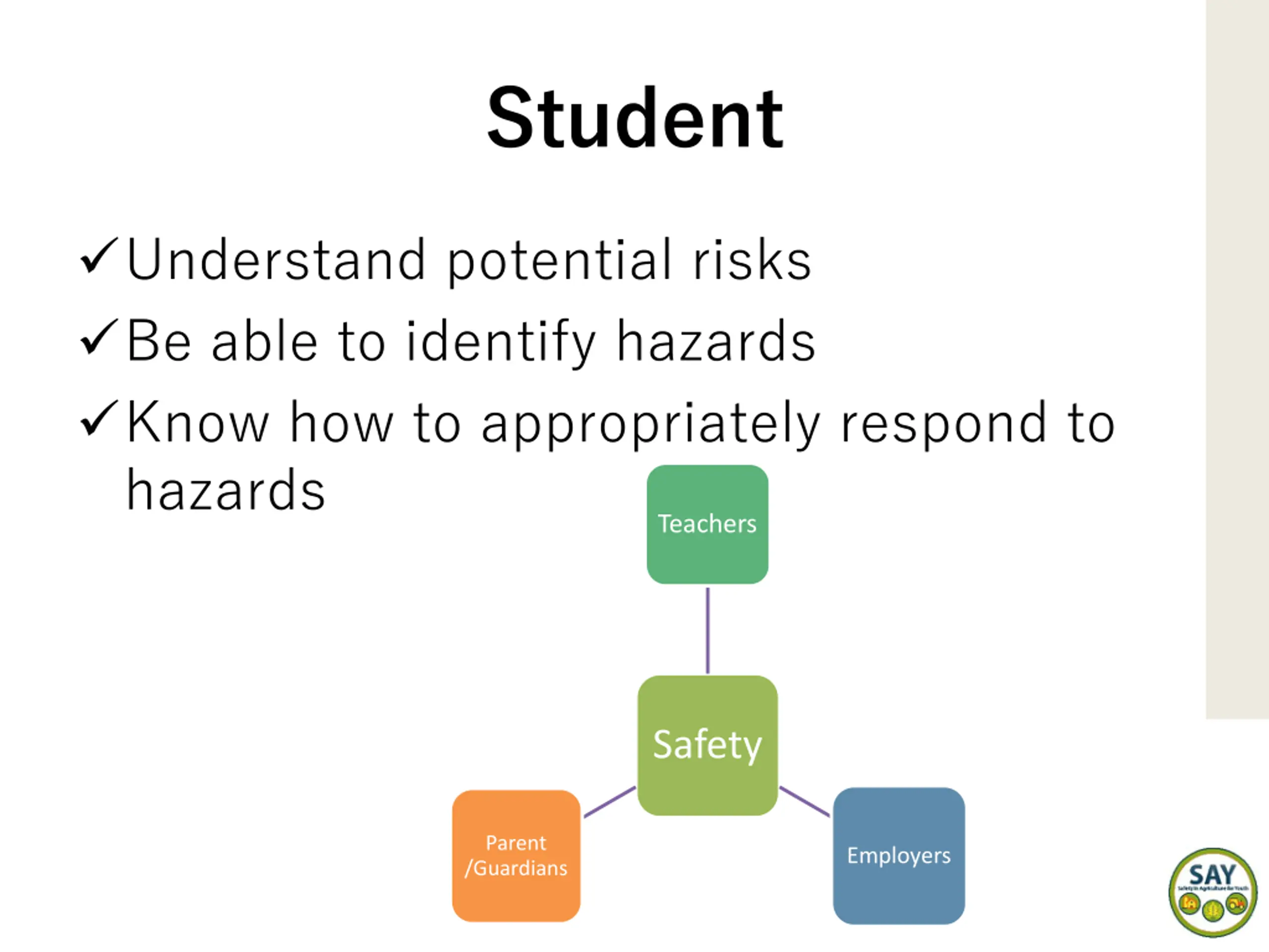 Student Understand potential risks Be able to identify hazards Know how to appropriately respond to hazards Teachers Safety Parent /Guardians Employers