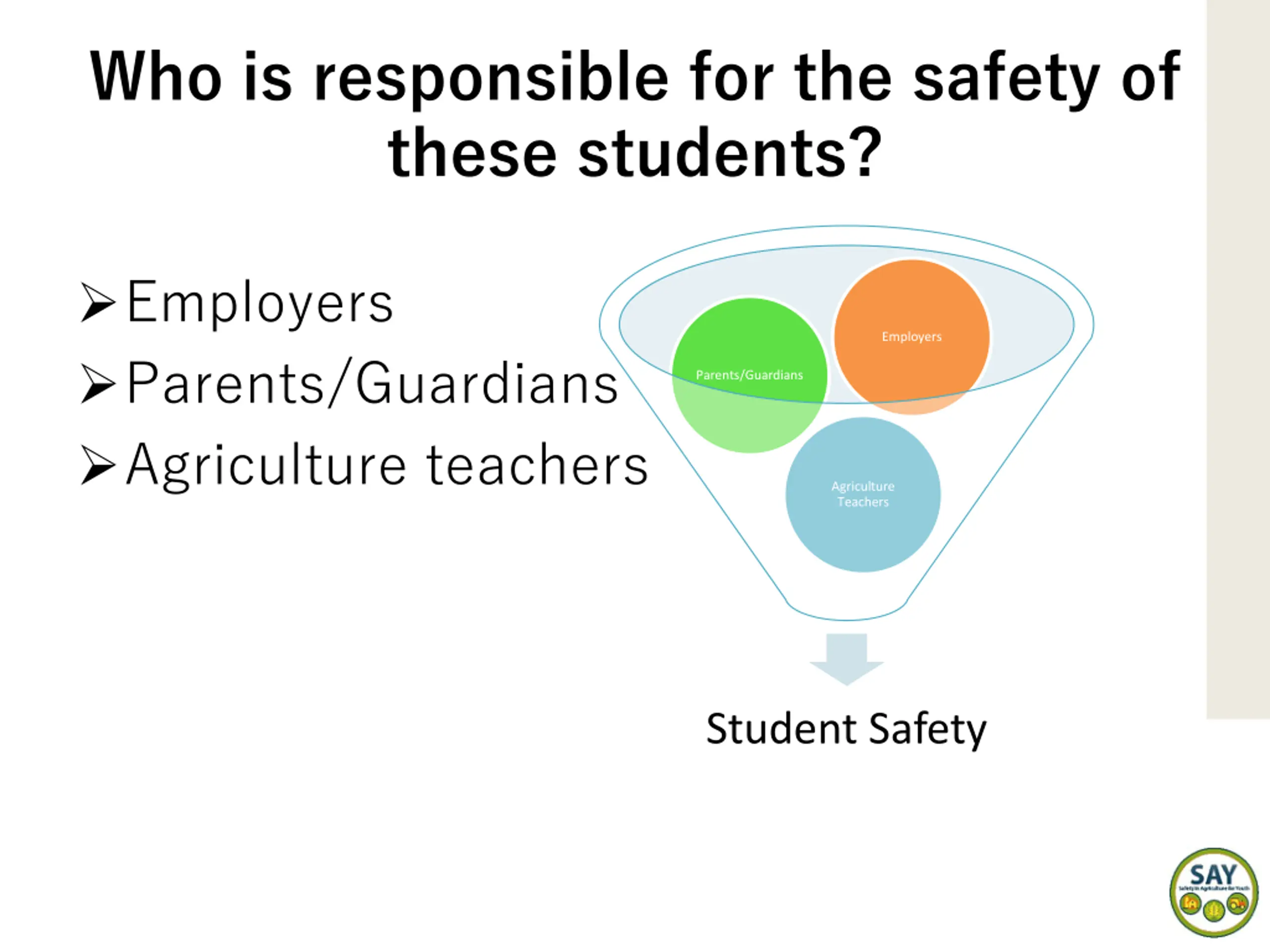Who is responsible for the safety of these students? Employers Parents/Guardians Agriculture teachers Employers Parents/Guardians Agriculture Teachers Student Safety