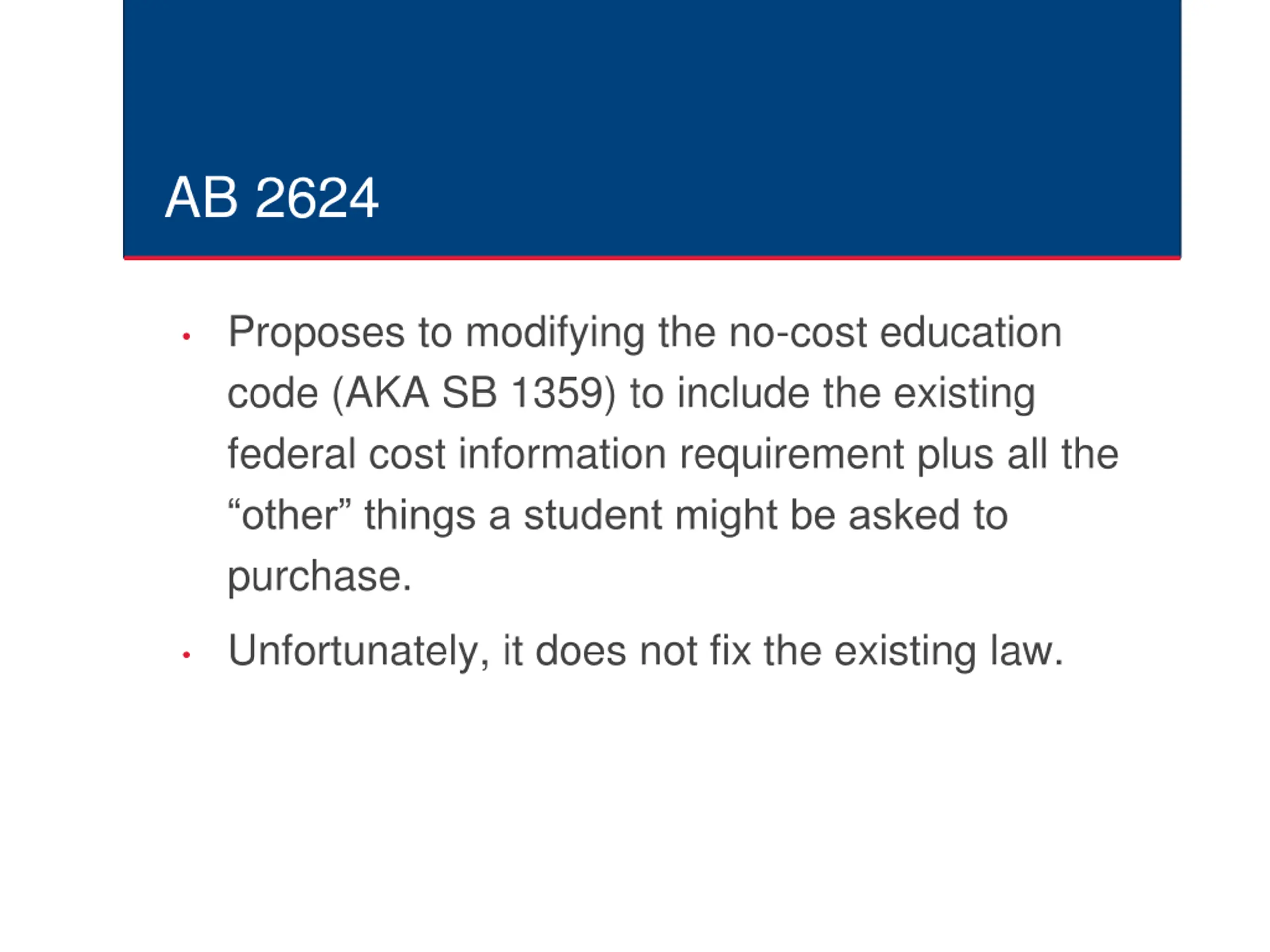 AB 2624 Proposes to modifying the no-cost education code (AKA SB 1359) to include the existing federal cost information requirement plus all the other things a student might be asked to purchase. Unfortunately, it does not fix the existing law.