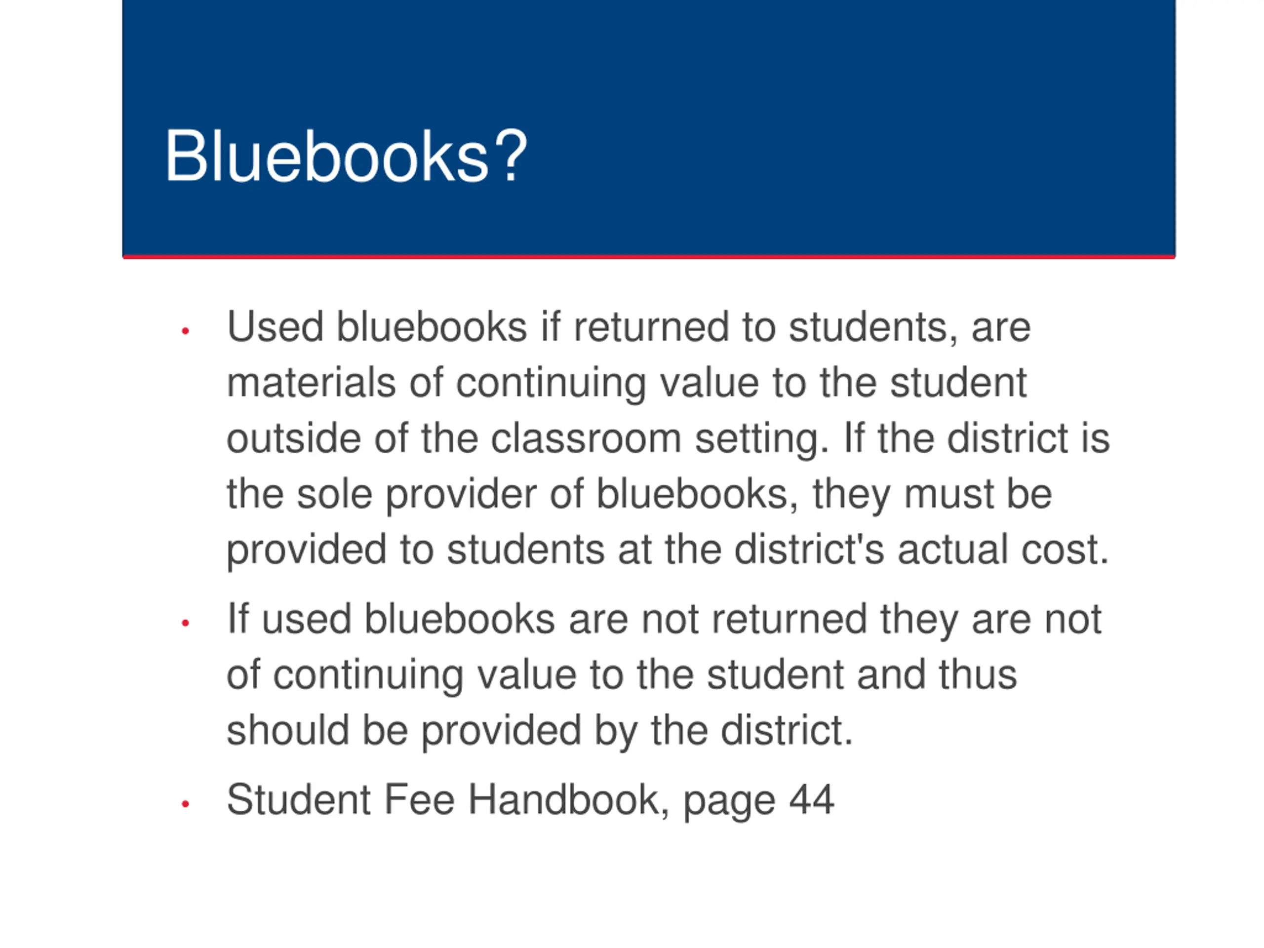 Bluebooks? Used bluebooks if returned to students, are materials of continuing value to the student outside of the classroom setting. If the district is the sole provider of bluebooks, they must be provided to students at the district's actual cost. If used bluebooks are not returned they are not of continuing value to the student and thus should be provided by the district. Student Fee Handbook, page 44