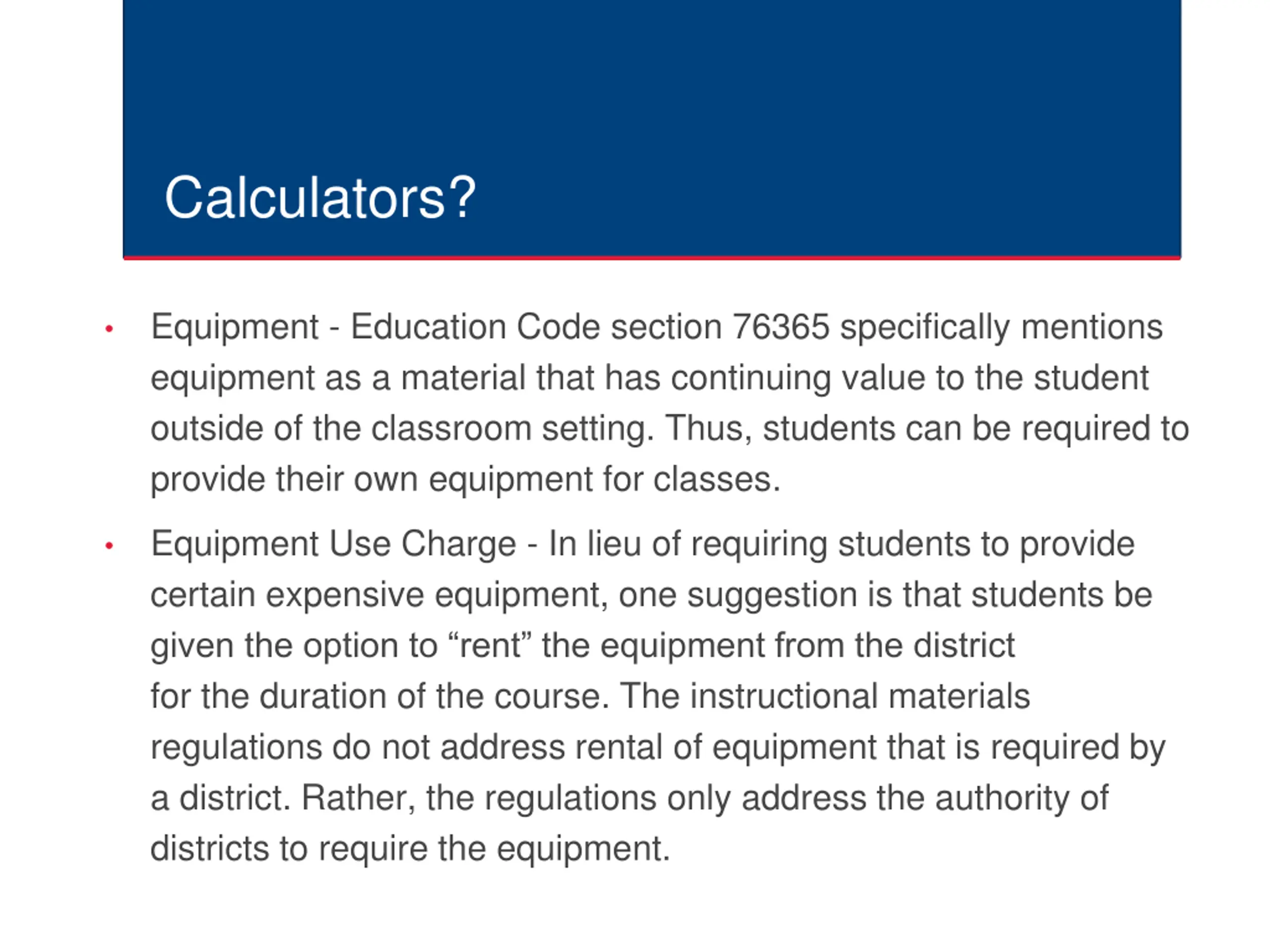 Calculators? Equipment - Education Code section 76365 specifically mentions equipment as a material that has continuing value to the student outside of the classroom setting. Thus, students can be required to provide their own equipment for classes. Equipment Use Charge - In lieu of requiring students to provide certain expensive equipment, one suggestion is that students be given the option to rent the equipment from the district for the duration of the course. The instructional materials regulations do not address rental of equipment that is required by a district. Rather, the regulations only address the authority of districts to require the equipment.