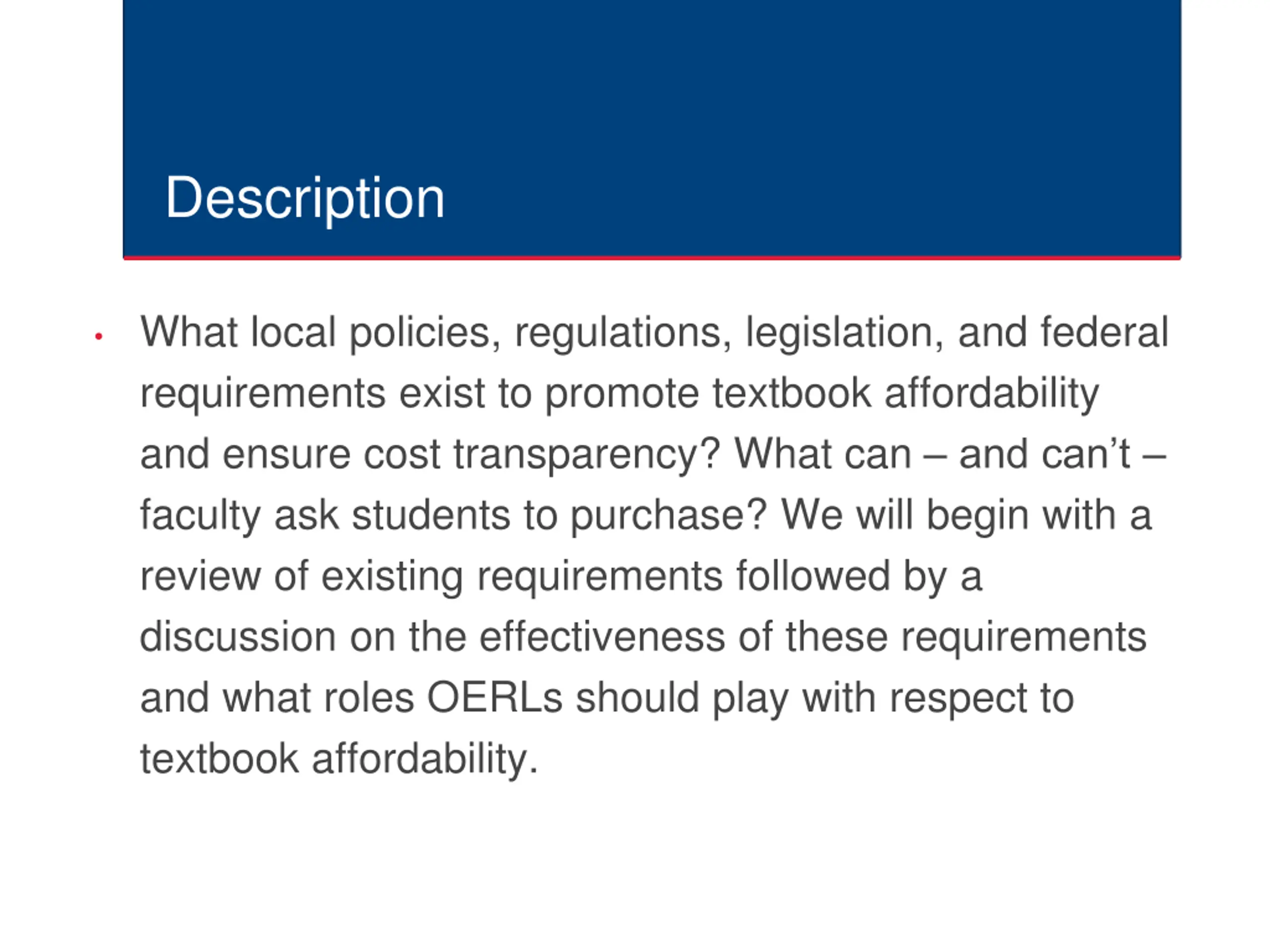 Description What local policies, regulations, legislation, and federal requirements exist to promote textbook affordability and ensure cost transparency? What can and can t faculty ask students to purchase? We will begin with a review of existing requirements followed by a discussion on the effectiveness of these requirements and what roles OERLs should play with respect to textbook affordability.
