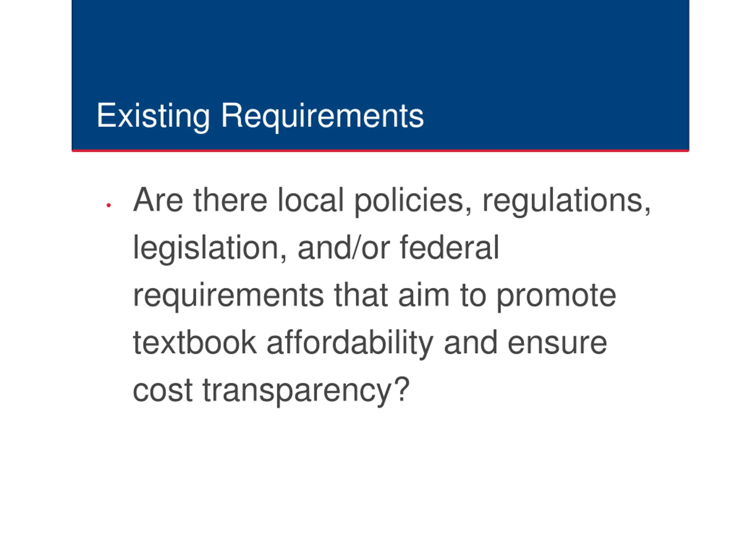 Existing Requirements Are there local policies, regulations, legislation, and/or federal requirements that aim to promote textbook affordability and ensure cost transparency?