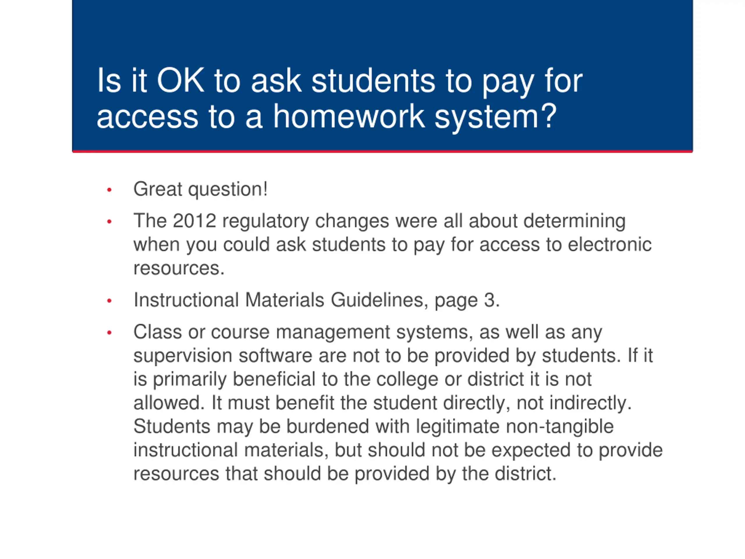 Is it OK to ask students to pay for access to a homework system? Great question! The 2012 regulatory changes were all about determining when you could ask students to pay for access to electronic resources. Instructional Materials Guidelines, page 3. Class or course management systems, as well as any supervision software are not to be provided by students. If it is primarily beneficial to the college or district it is not allowed. It must benefit the student directly, not indirectly. Students may be burdened with legitimate non-tangible instructional materials, but should not be expected to provide resources that should be provided by the district.