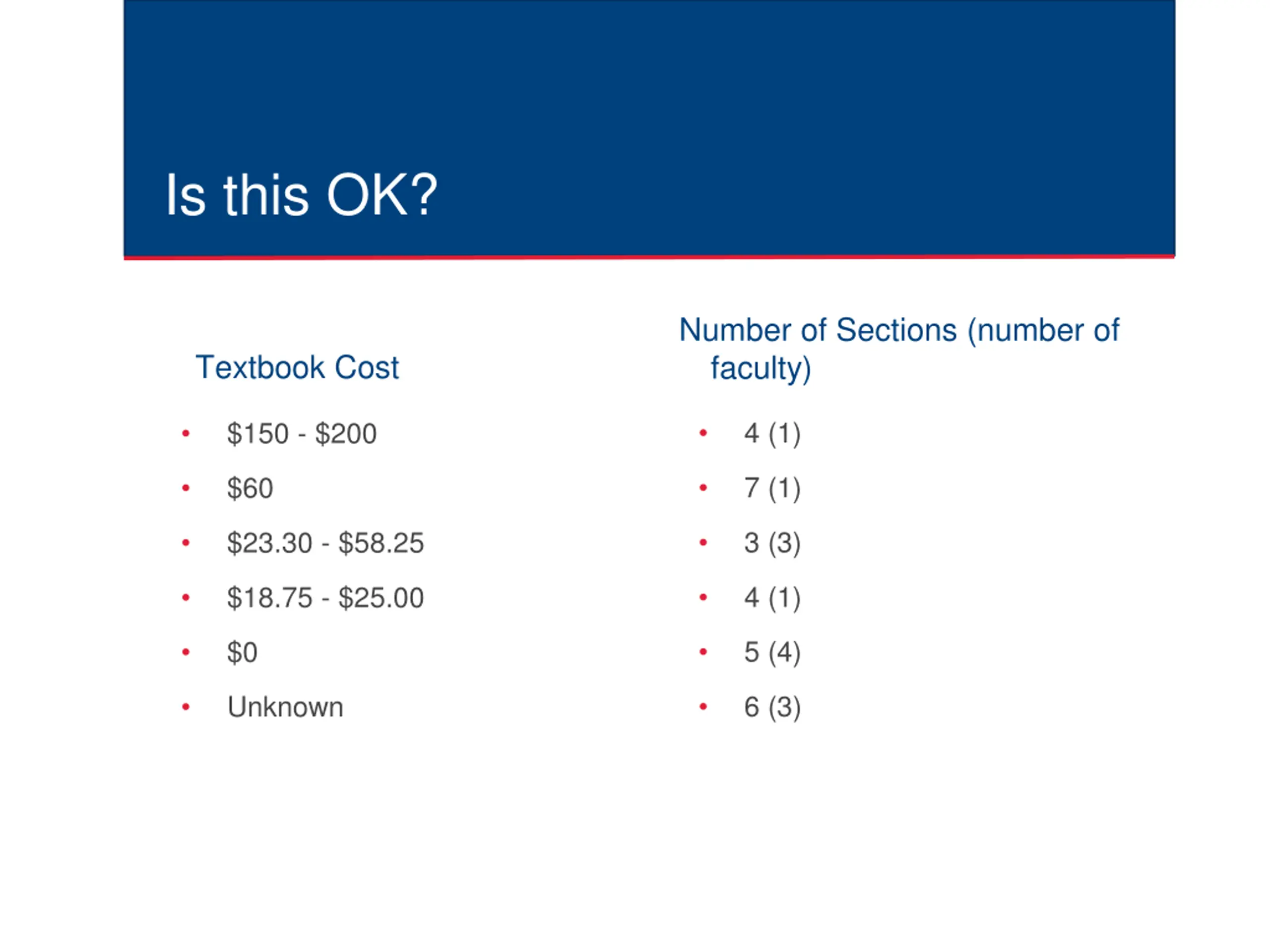 Is this OK? Number of Sections (number of faculty) Textbook Cost 4 (1) $150 - $200 7 (1) $60 3 (3) $23.30 - $58.25 4 (1) $18.75 - $25.00 5 (4) $0 6 (3) Unknown
