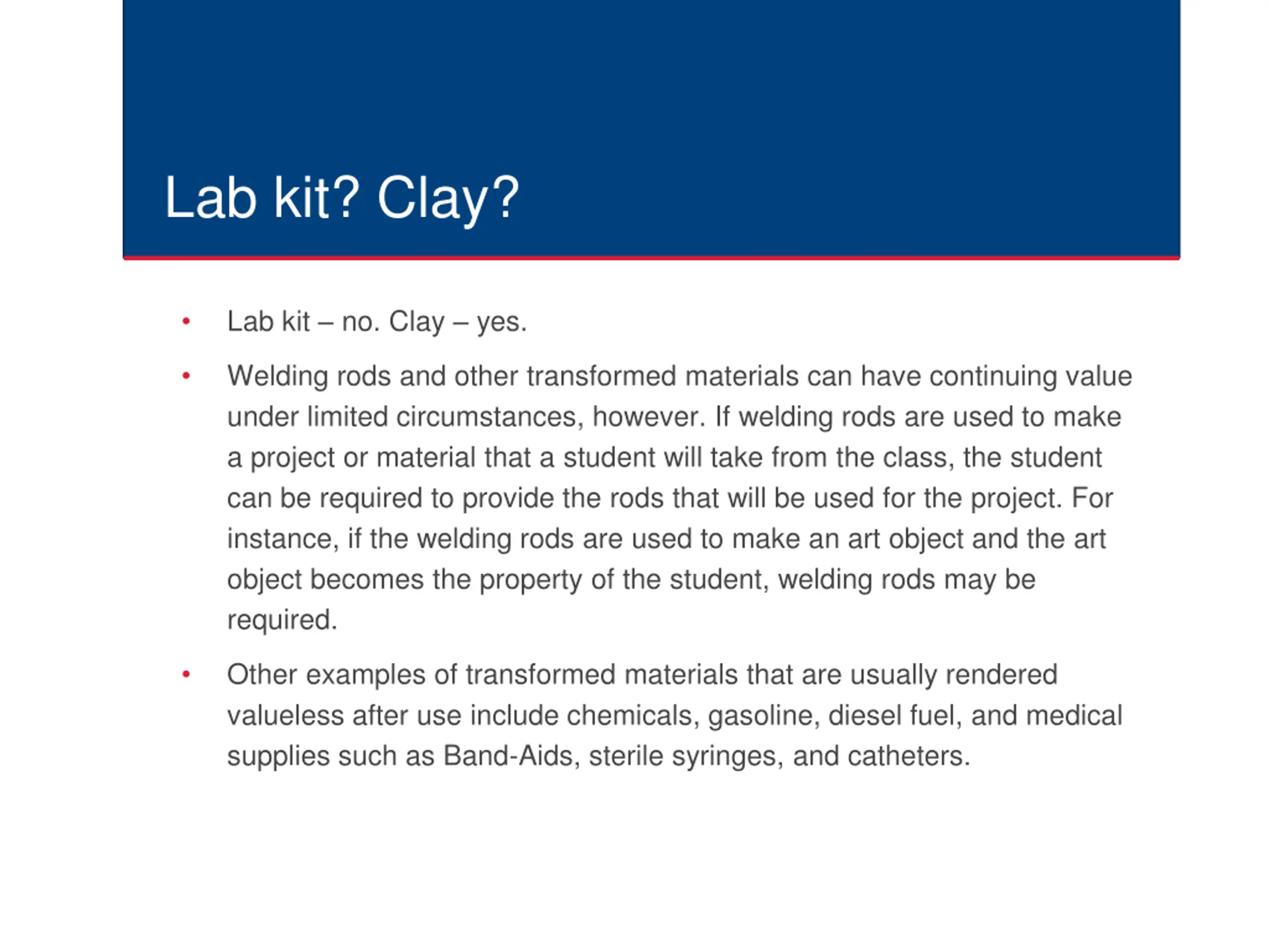 Lab kit? Clay? Lab kit no. Clay yes. Welding rods and other transformed materials can have continuing value under limited circumstances, however. If welding rods are used to make a project or material that a student will take from the class, the student can be required to provide the rods that will be used for the project. For instance, if the welding rods are used to make an art object and the art object becomes the property of the student, welding rods may be required. Other examples of transformed materials that are usually rendered valueless after use include chemicals, gasoline, diesel fuel, and medical supplies such as Band-Aids, sterile syringes, and catheters.