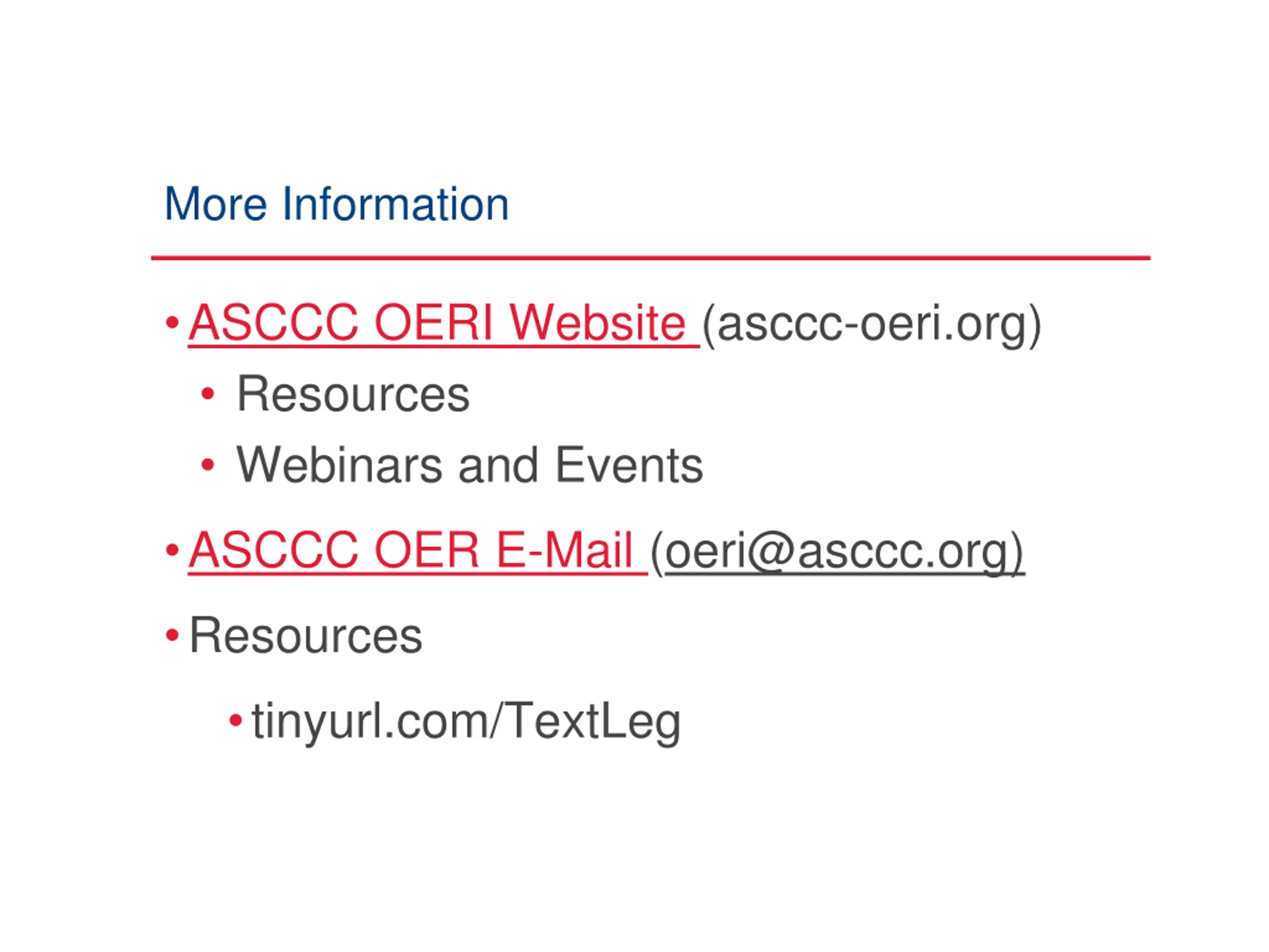 More Information ASCCC OERI Website (asccc-oeri.org) Resources Webinars and Events ASCCC OER E-Mail (oeri@asccc.org) Resources tinyurl.com/TextLeg