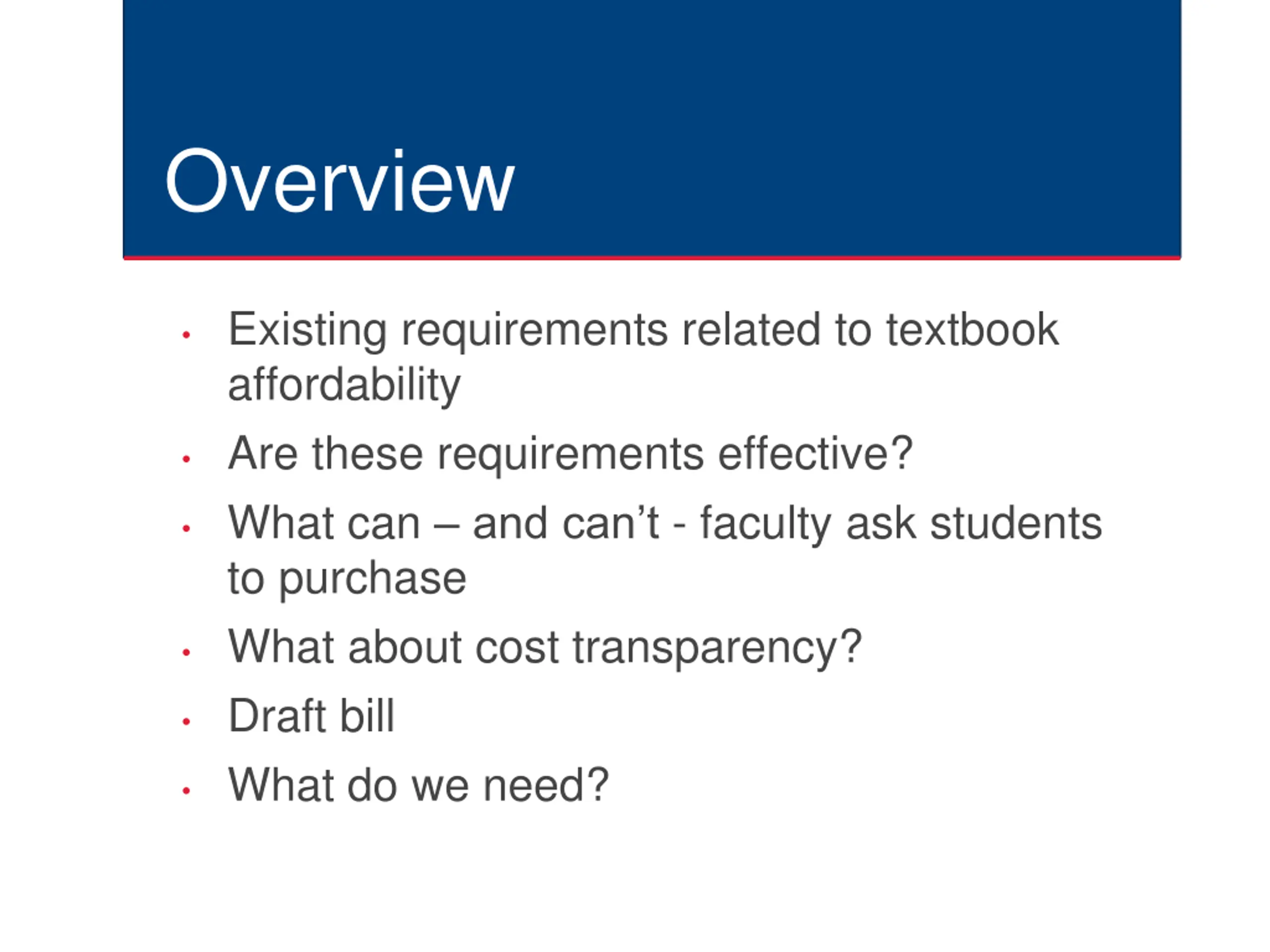 Overview Existing requirements related to textbook affordability Are these requirements effective? What can and can t - faculty ask students to purchase What about cost transparency? Draft bill What do we need?