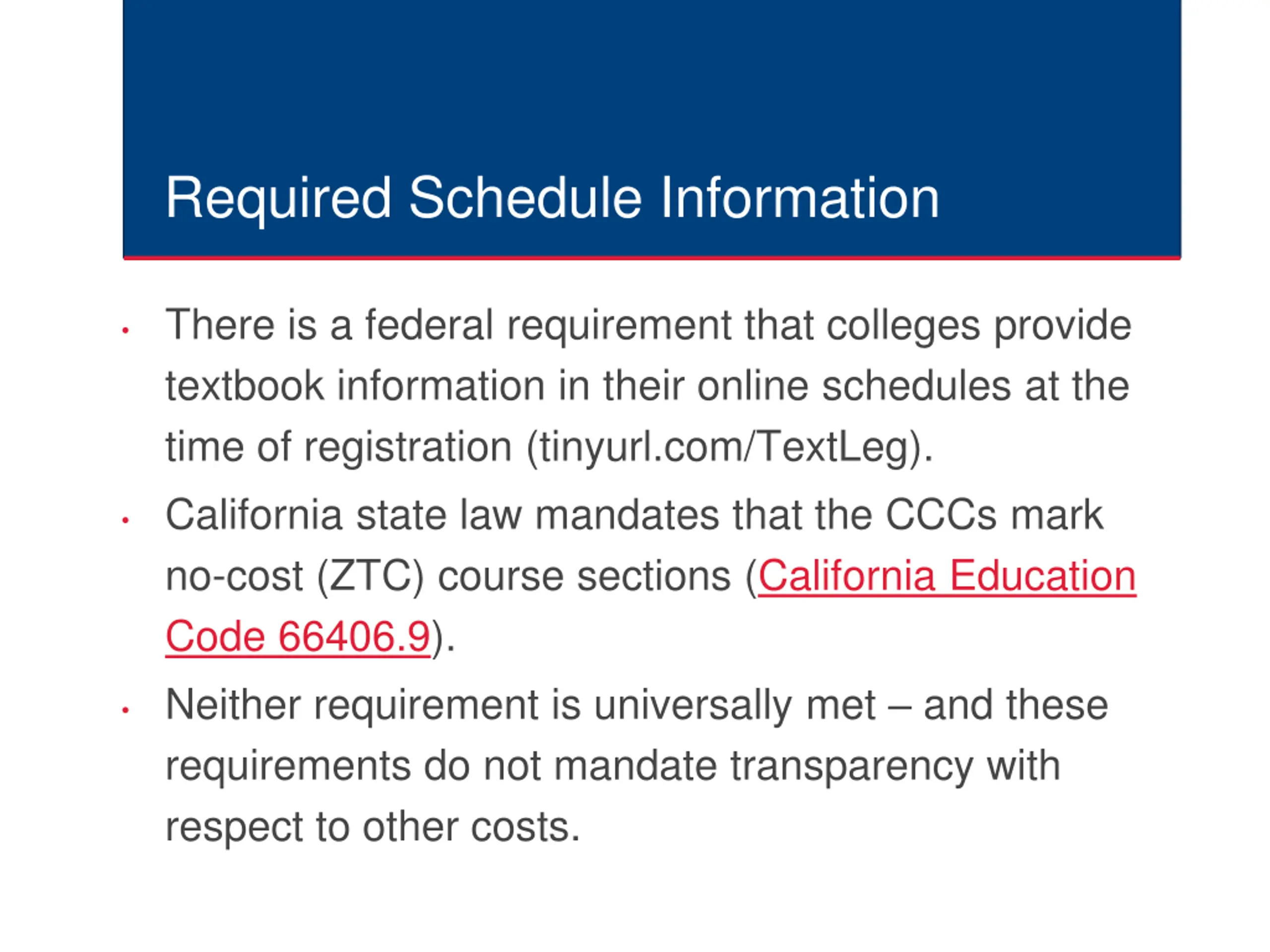 Required Schedule Information There is a federal requirement that colleges provide textbook information in their online schedules at the time of registration (tinyurl.com/TextLeg). California state law mandates that the CCCs mark no-cost (ZTC) course sections (California Education Code 66406.9). Neither requirement is universally met and these requirements do not mandate transparency with respect to other costs.