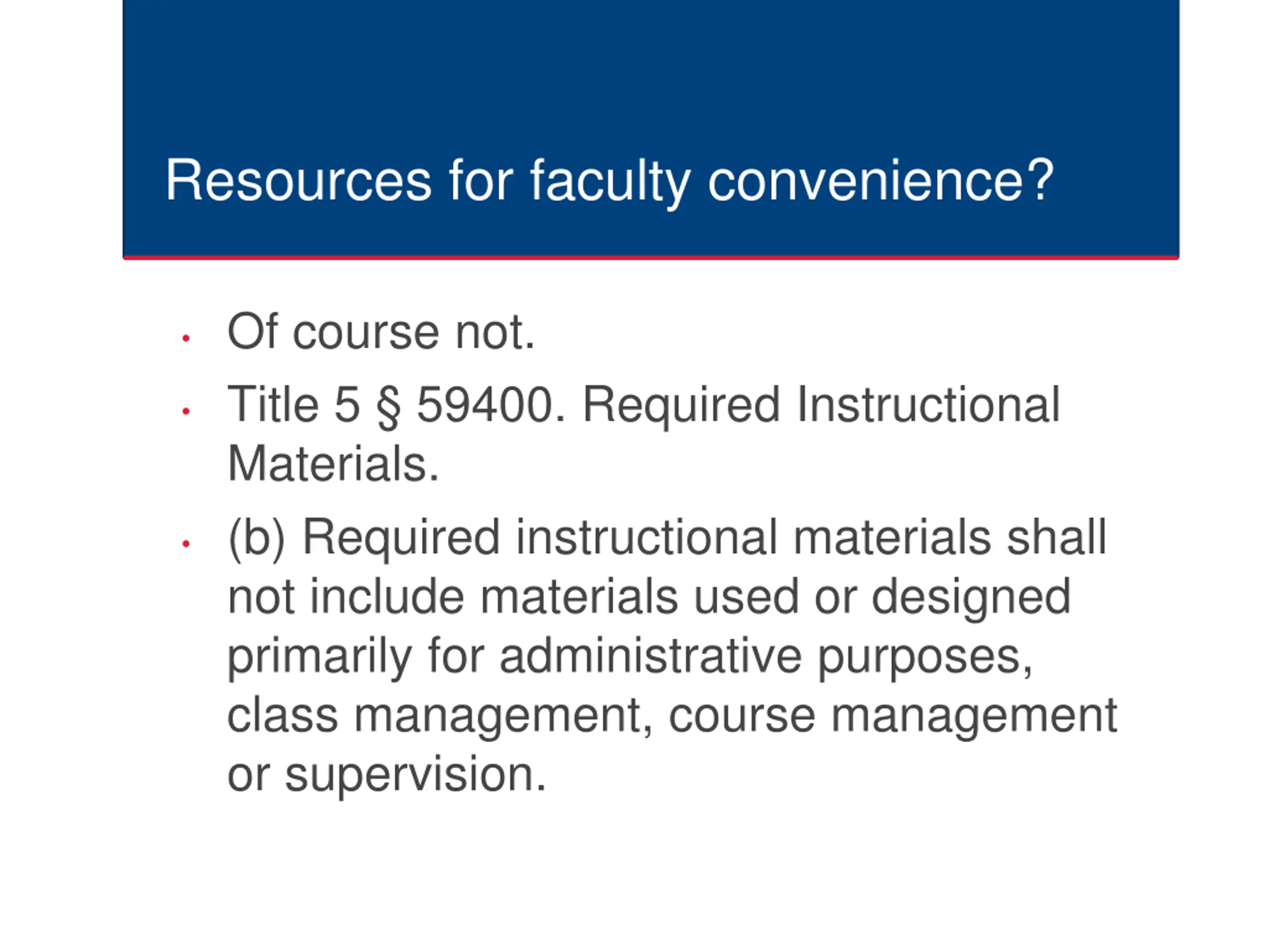 Resources for faculty convenience? Of course not. Title 5 59400. Required Instructional Materials. (b) Required instructional materials shall not include materials used or designed primarily for administrative purposes, class management, course management or supervision.