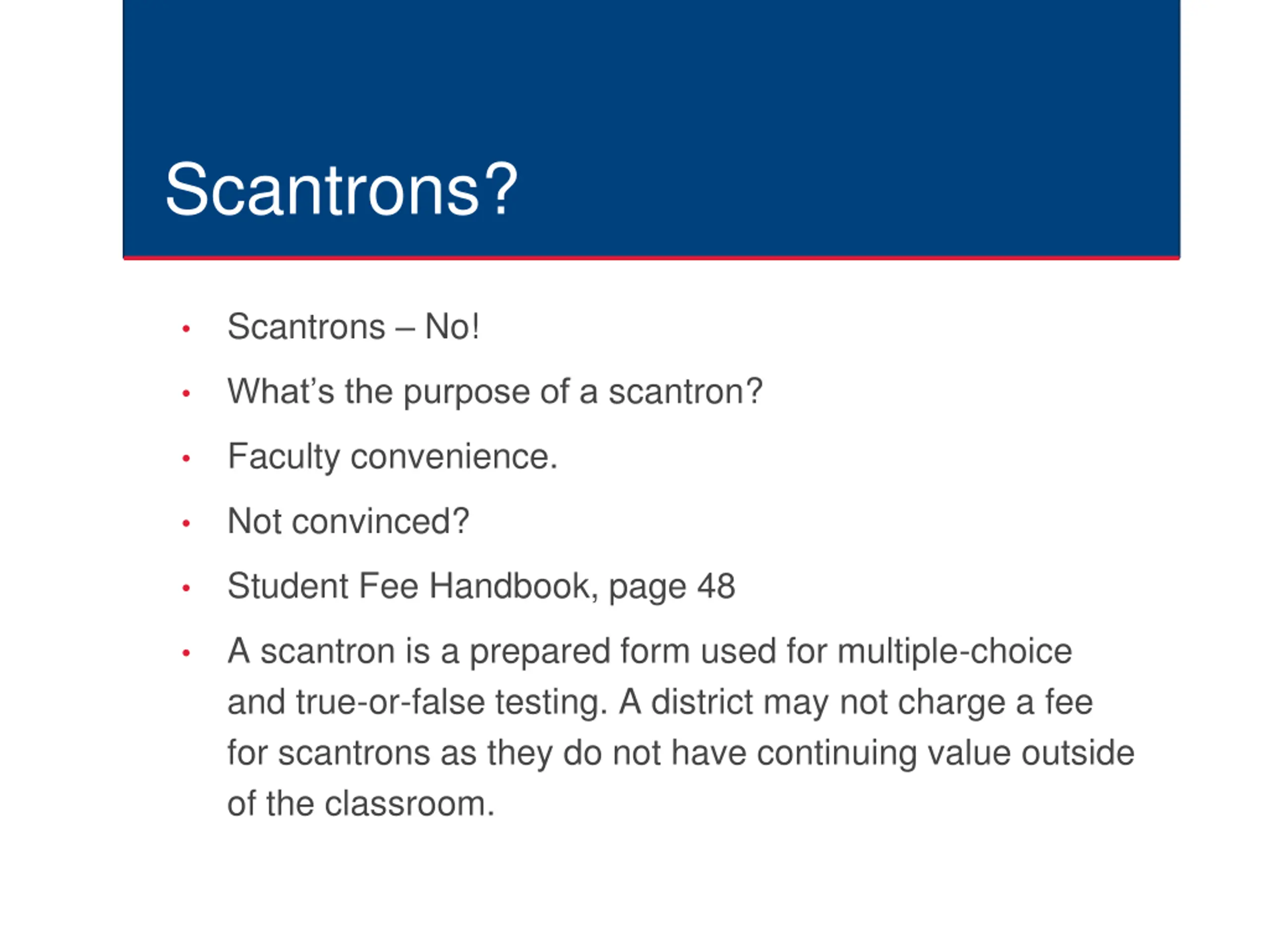 Scantrons? Scantrons No! What s the purpose of a scantron? Faculty convenience. Not convinced? Student Fee Handbook, page 48 A scantron is a prepared form used for multiple-choice and true-or-false testing. A district may not charge a fee for scantrons as they do not have continuing value outside of the classroom.