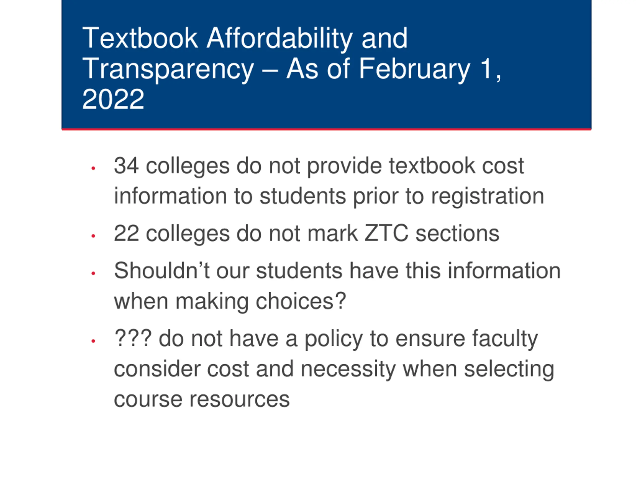 Textbook Affordability and Transparency As of February 1, 2022 34 colleges do not provide textbook cost information to students prior to registration 22 colleges do not mark ZTC sections Shouldn t our students have this information when making choices? ??? do not have a policy to ensure faculty consider cost and necessity when selecting course resources