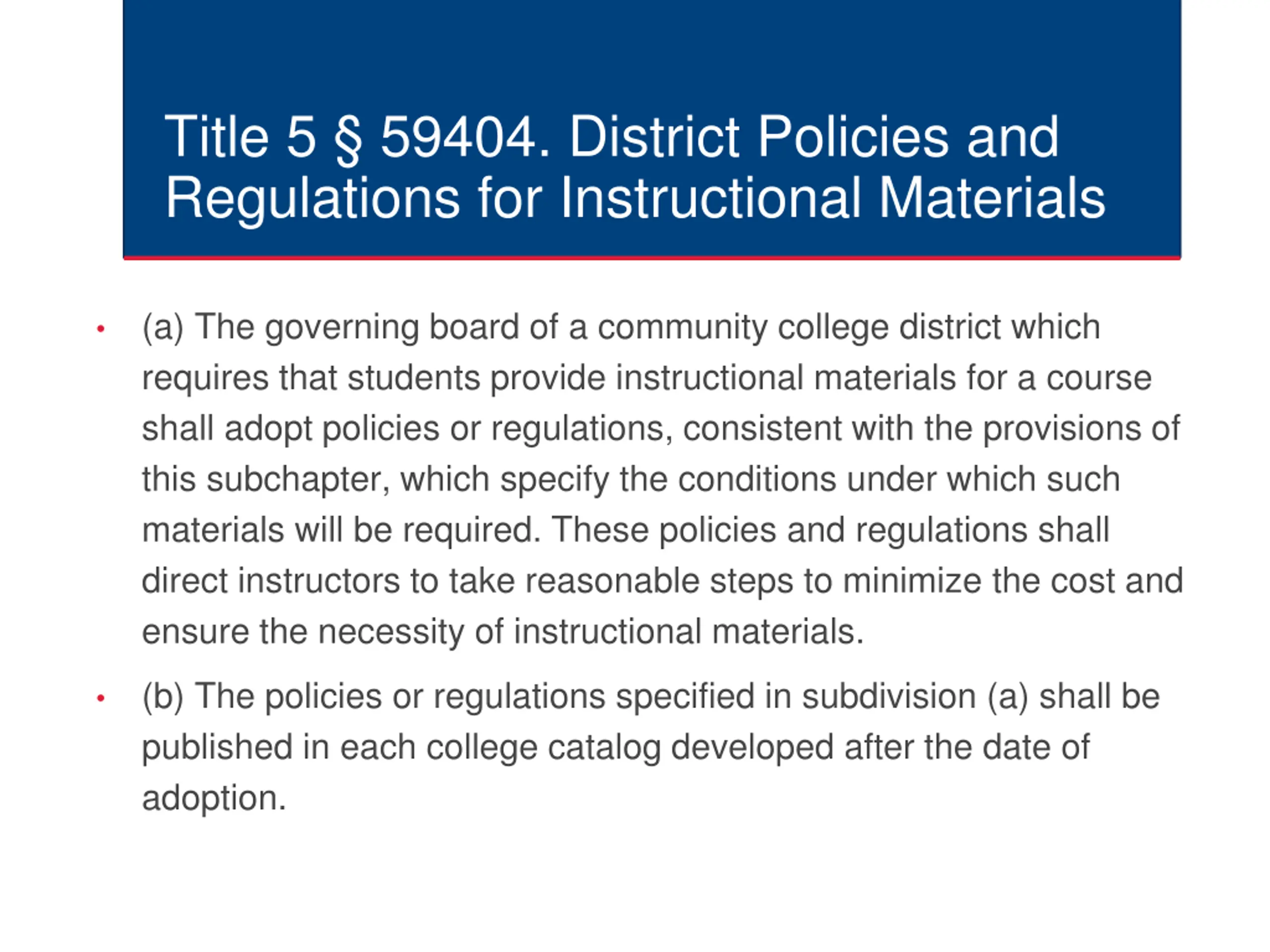 Title 5 59404. District Policies and Regulations for Instructional Materials (a) The governing board of a community college district which requires that students provide instructional materials for a course shall adopt policies or regulations, consistent with the provisions of this subchapter, which specify the conditions under which such materials will be required. These policies and regulations shall direct instructors to take reasonable steps to minimize the cost and ensure the necessity of instructional materials. (b) The policies or regulations specified in subdivision (a) shall be published in each college catalog developed after the date of adoption.