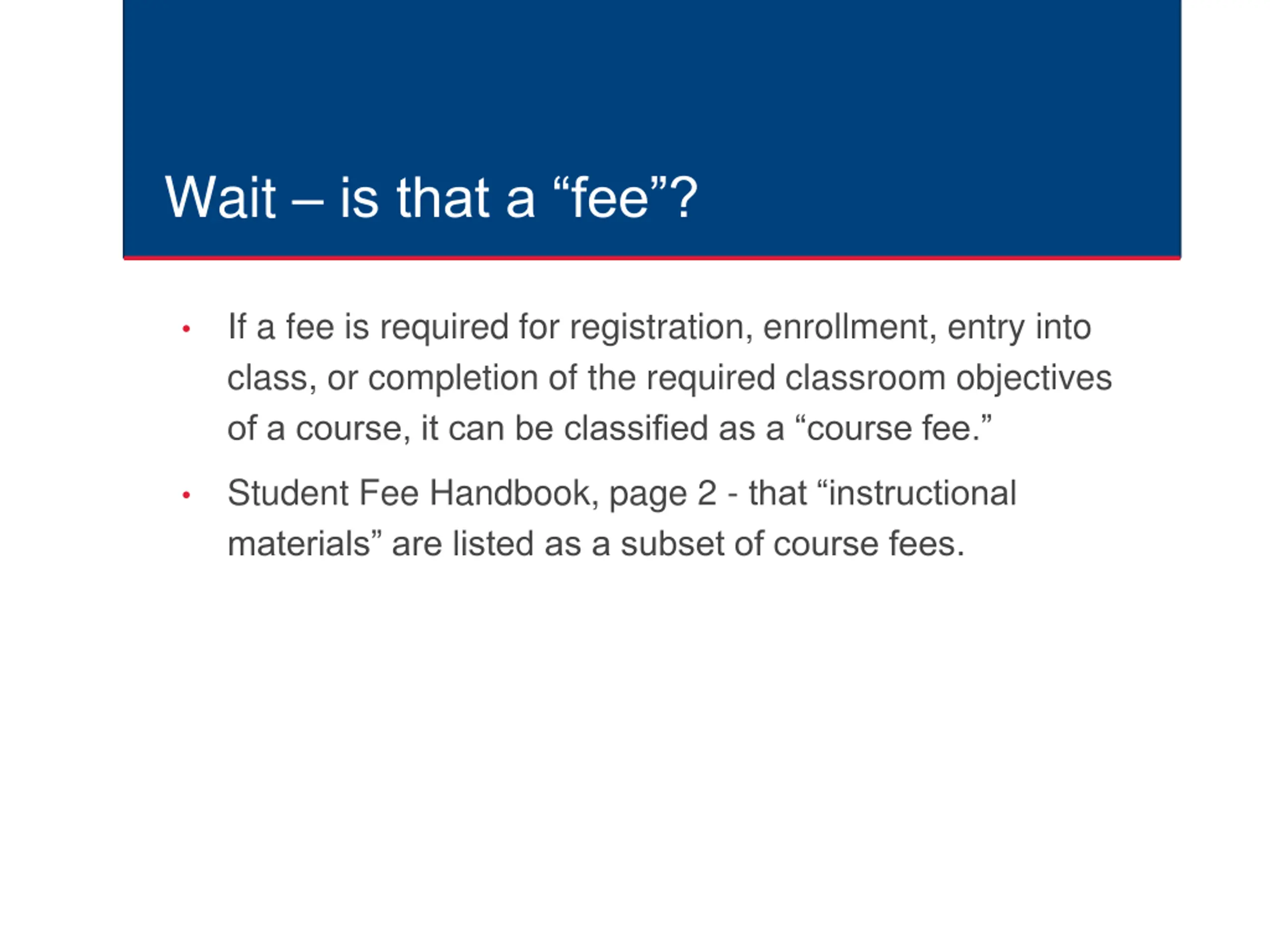 Wait is that a fee? If a fee is required for registration, enrollment, entry into class, or completion of the required classroom objectives of a course, it can be classified as a course fee. Student Fee Handbook, page 2 - that instructional materials are listed as a subset of course fees.