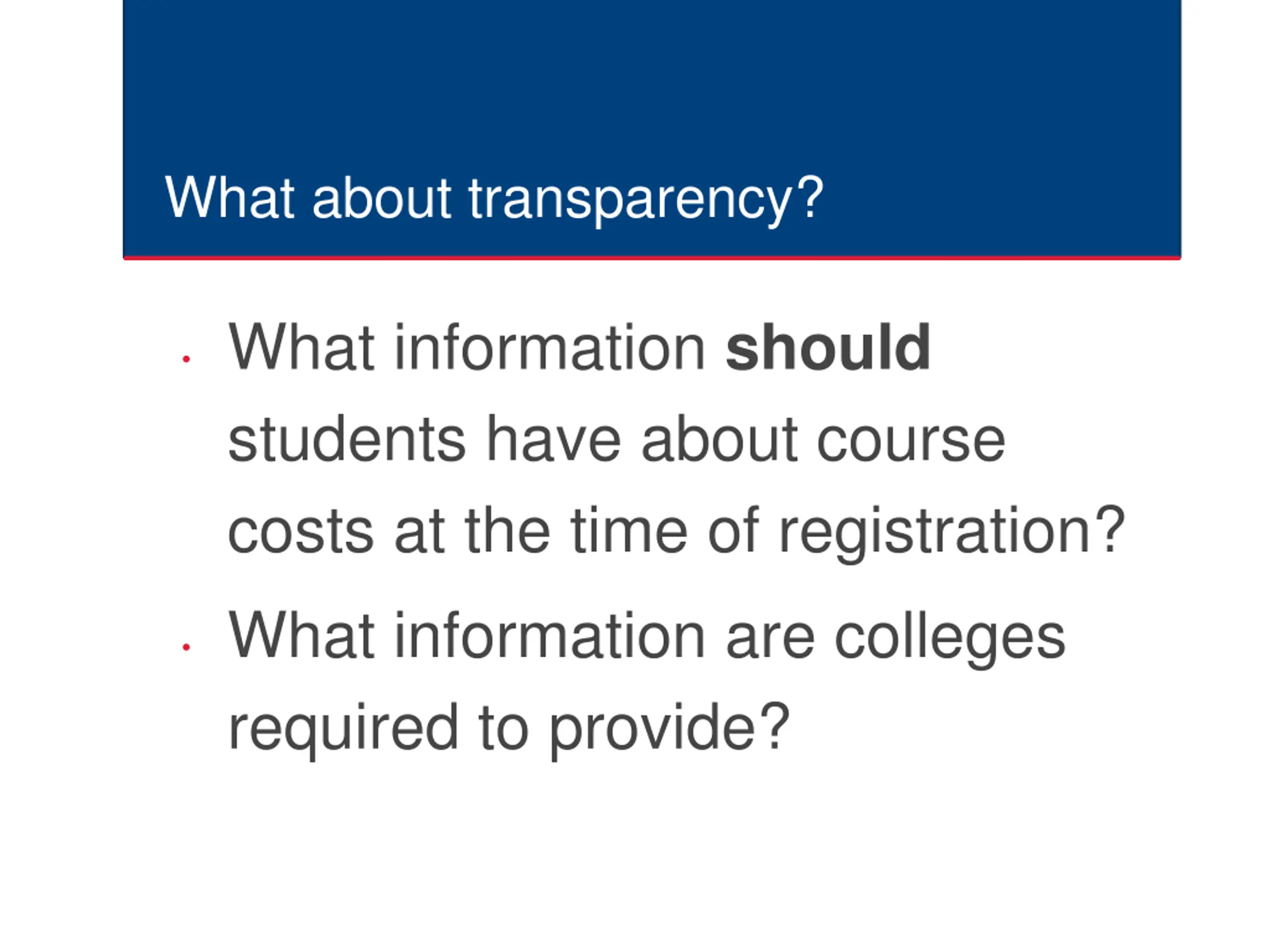 What about transparency? What information should students have about course costs at the time of registration? What information are colleges required to provide?