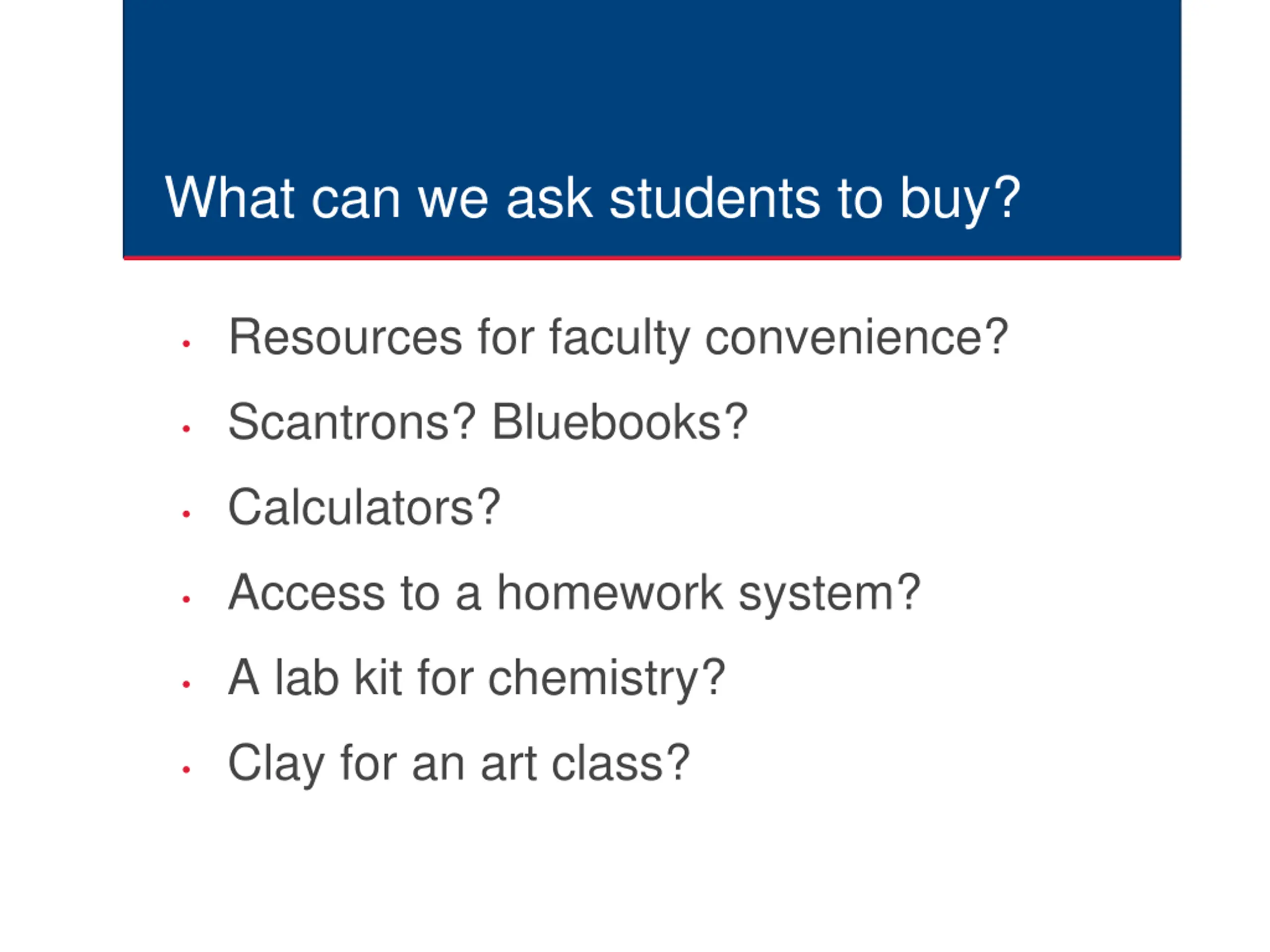 What can we ask students to buy? Resources for faculty convenience? Scantrons? Bluebooks? Calculators? Access to a homework system? A lab kit for chemistry? Clay for an art class?