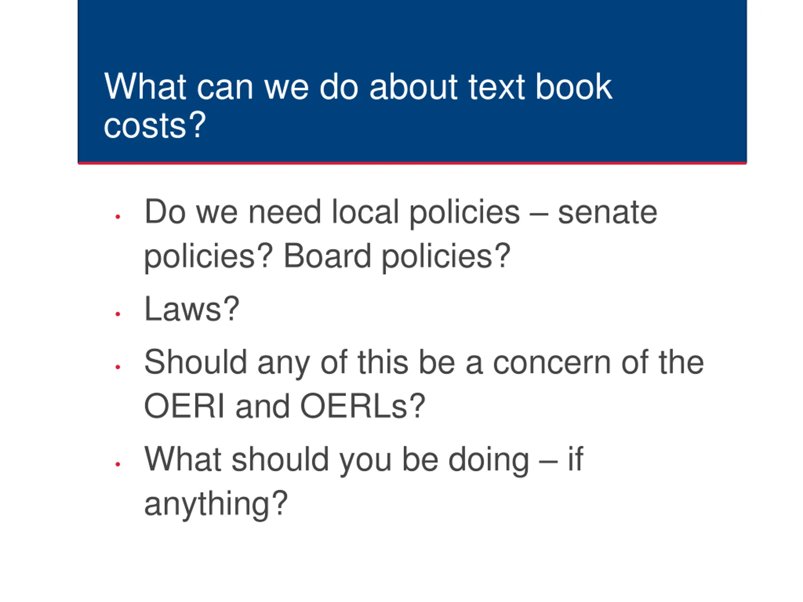 What can we do about text book costs? Do we need local policies senate policies? Board policies? Laws? Should any of this be a concern of the OERI and OERLs? What should you be doing if anything?