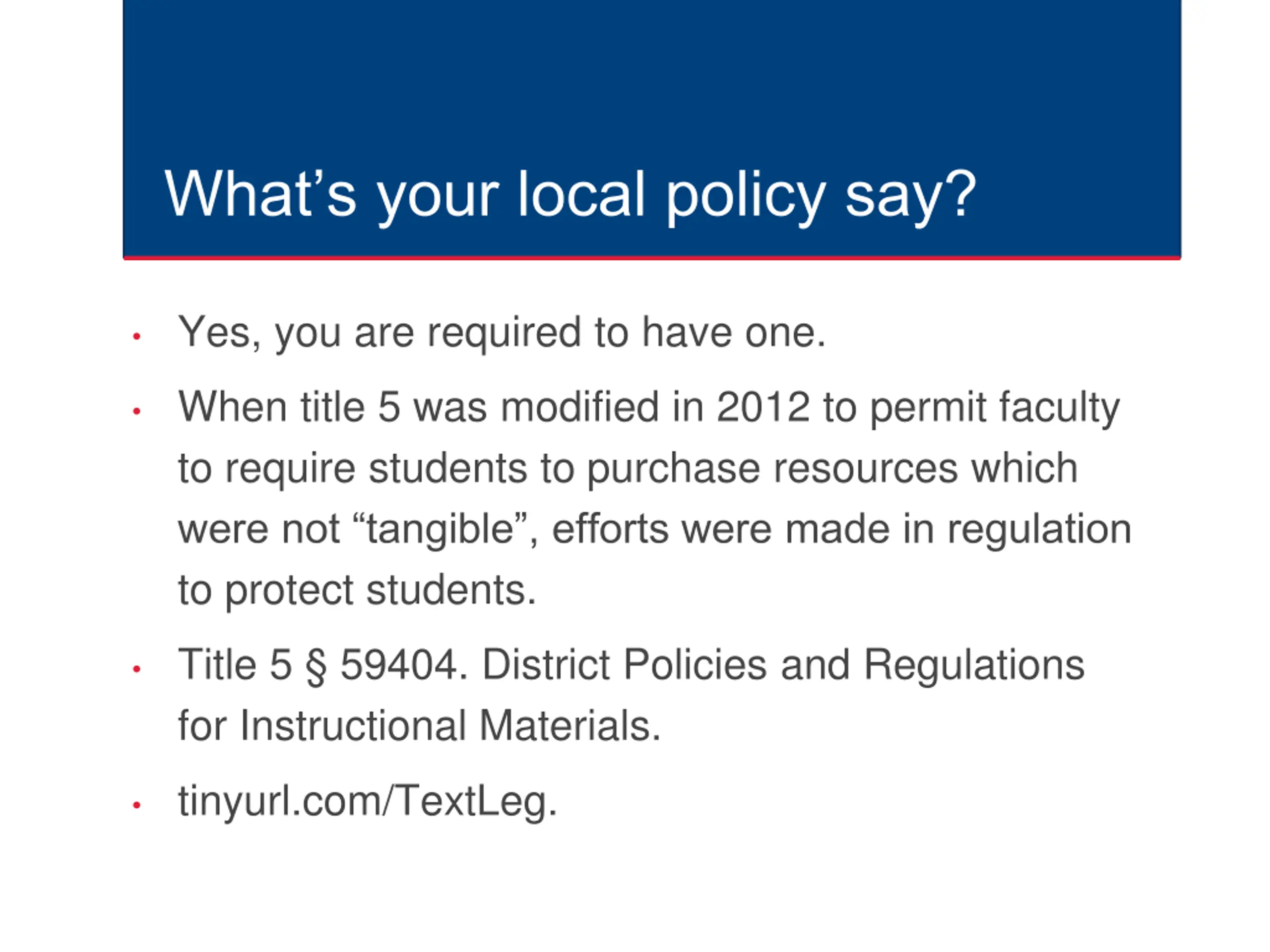 Whats your local policy say? Yes, you are required to have one. When title 5 was modified in 2012 to permit faculty to require students to purchase resources which were not tangible , efforts were made in regulation to protect students. Title 5 59404. District Policies and Regulations for Instructional Materials. tinyurl.com/TextLeg.
