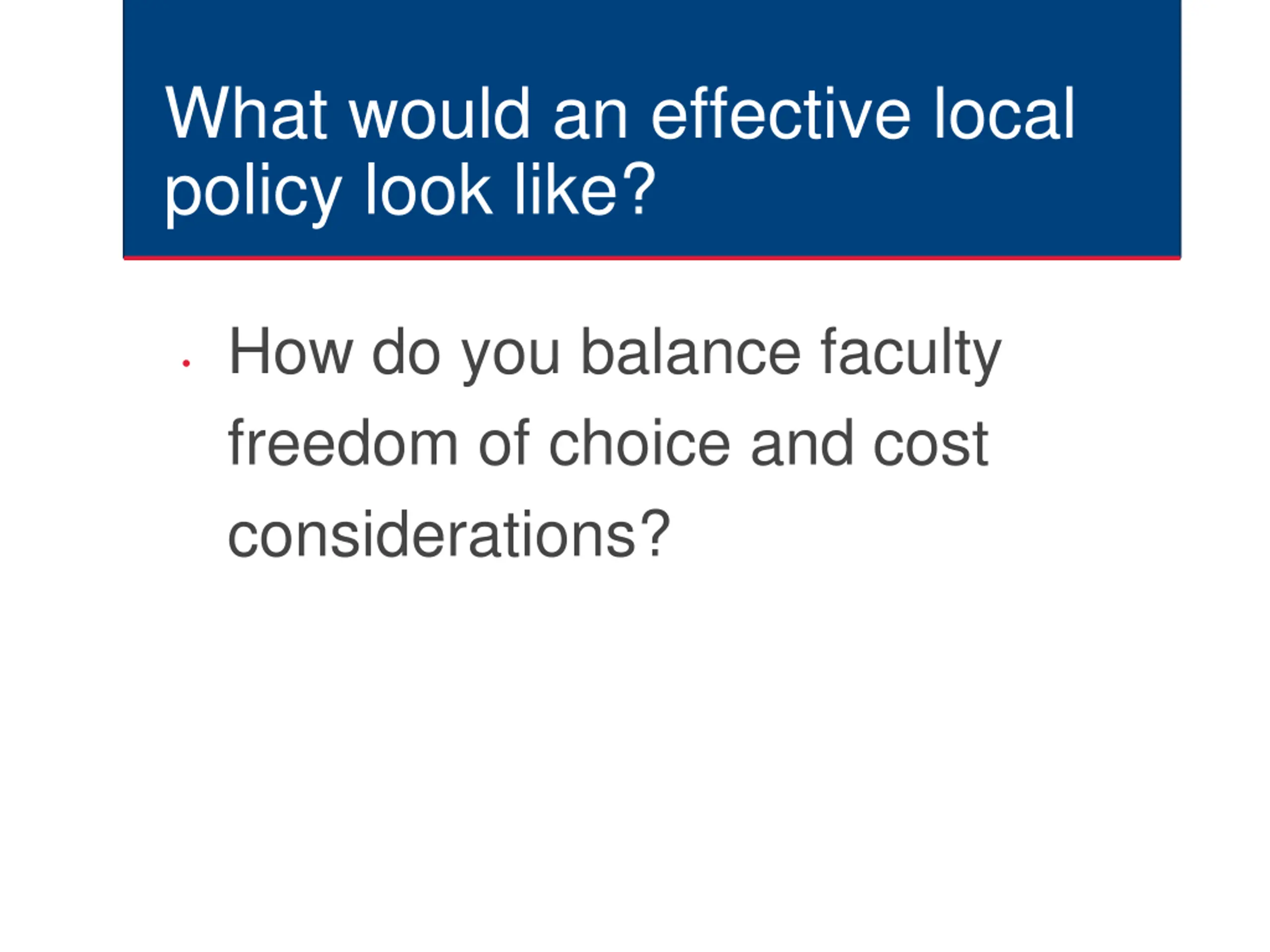 What would an effective local policy look like? How do you balance faculty freedom of choice and cost considerations?