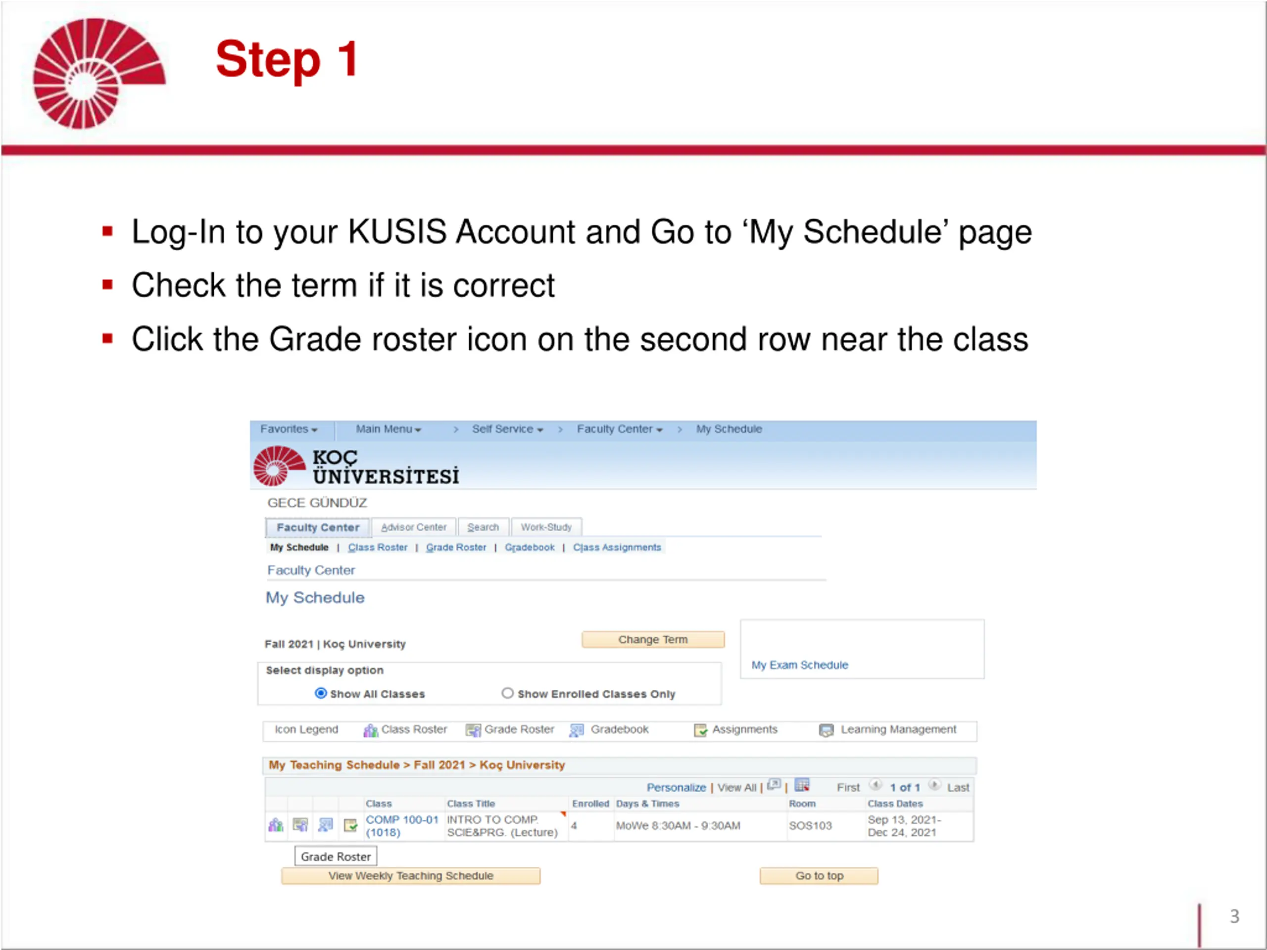 Step 1 Log-In to your KUSIS Account and Go to My Schedule page Check the term if it is correct Click the Grade roster icon on the second row near the class 3