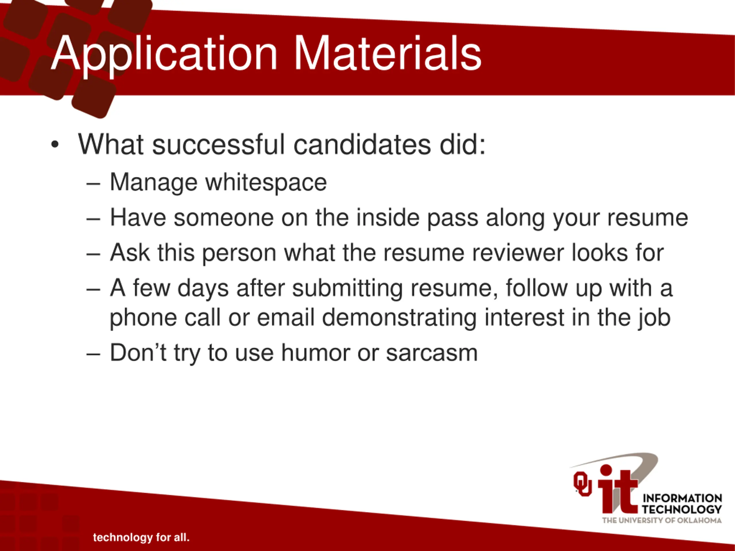 Application Materials What successful candidates did: Manage whitespace Have someone on the inside pass along your resume Ask this person what the resume reviewer looks for A few days after submitting resume, follow up with a phone call or email demonstrating interest in the job Don t try to use humor or sarcasm technology for all.