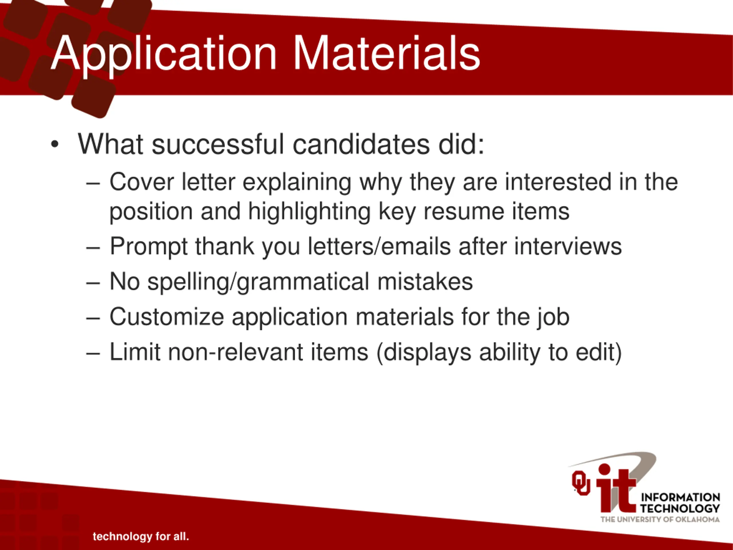 Application Materials What successful candidates did: Cover letter explaining why they are interested in the position and highlighting key resume items Prompt thank you letters/emails after interviews No spelling/grammatical mistakes Customize application materials for the job Limit non-relevant items (displays ability to edit) technology for all.