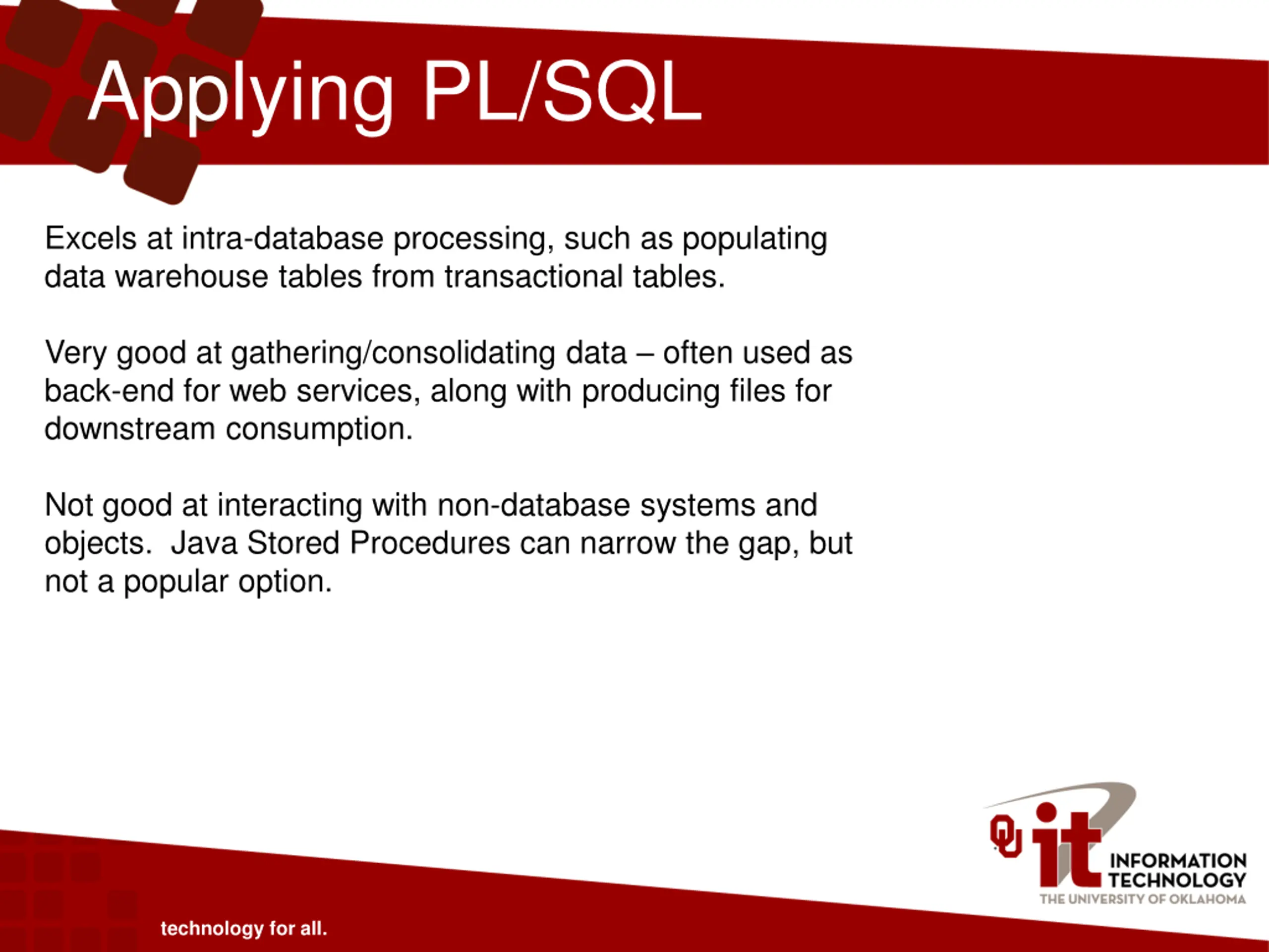 Applying PL/SQL Excels at intra-database processing, such as populating data warehouse tables from transactional tables. Very good at gathering/consolidating data often used as back-end for web services, along with producing files for downstream consumption. Not good at interacting with non-database systems and objects. Java Stored Procedures can narrow the gap, but not a popular option. technology for all.