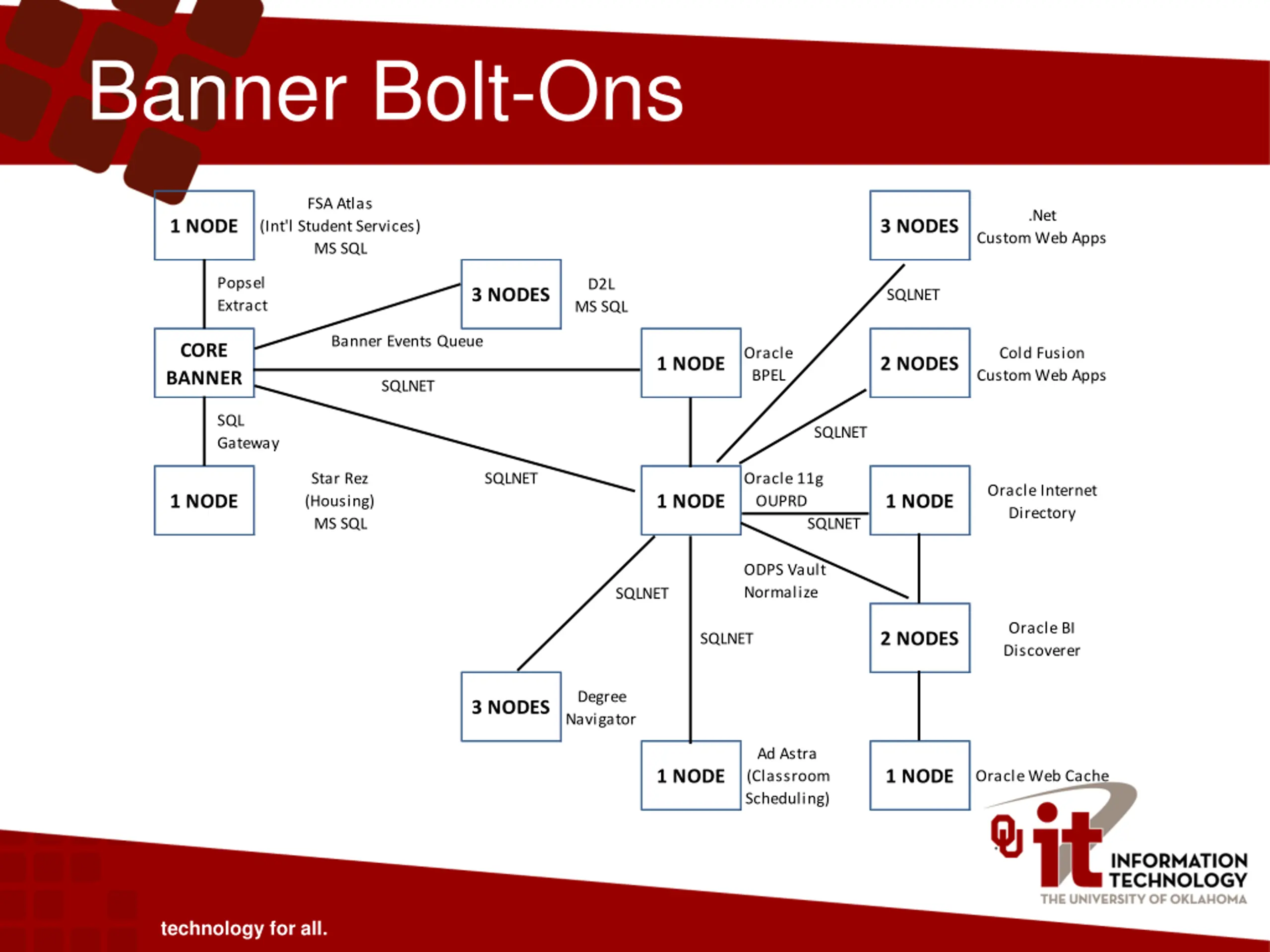 Banner Bolt-Ons FSA Atlas .Net 1 NODE 3 NODES (Int'l Student Services) MS SQL Custom Web Apps Popsel Extract D2L MS SQL 3 NODES SQLNET Banner Events Queue CORE BANNER Oracle BPEL Cold Fusion Custom Web Apps 1 NODE 2 NODES SQLNET SQL Gateway SQLNET Star Rez (Housing) MS SQL SQLNET Oracle 11g OUPRD SQLNET Oracle Internet Directory 1 NODE 1 NODE 1 NODE ODPS Vault Normalize SQLNET Oracle BI Discoverer 2 NODES SQLNET Degree Navigator 3 NODES Ad Astra (Classroom Scheduling) 1 NODE 1 NODE Oracle Web Cache technology for all.