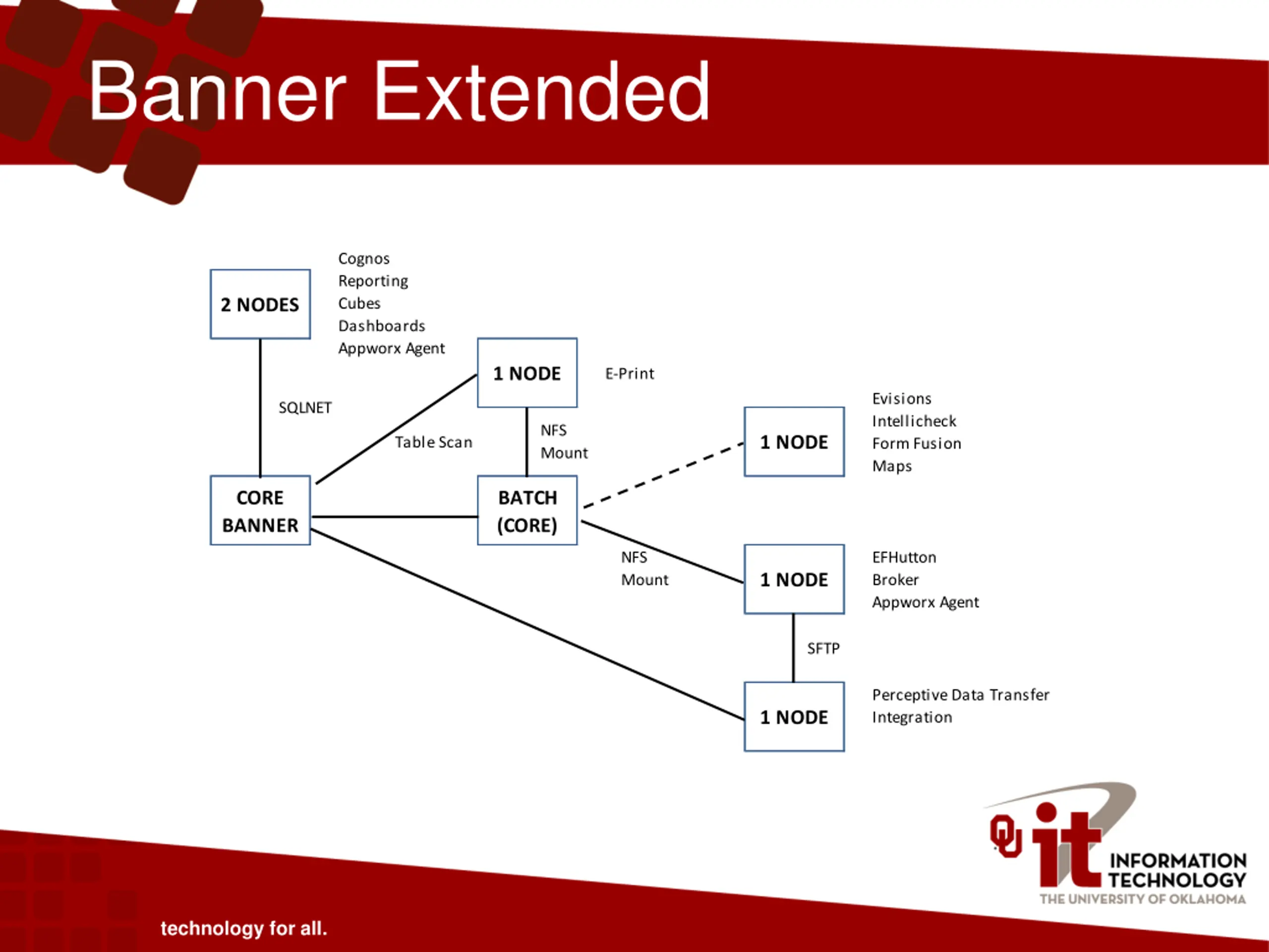Banner Extended Cognos Reporting Cubes Dashboards Appworx Agent 2 NODES 1 NODE E-Print Evisions Intellicheck Form Fusion Maps SQLNET NFS Mount 1 NODE Table Scan CORE BANNER BATCH (CORE) NFS Mount EFHutton Broker Appworx Agent 1 NODE SFTP Perceptive Data Transfer Integration 1 NODE technology for all.