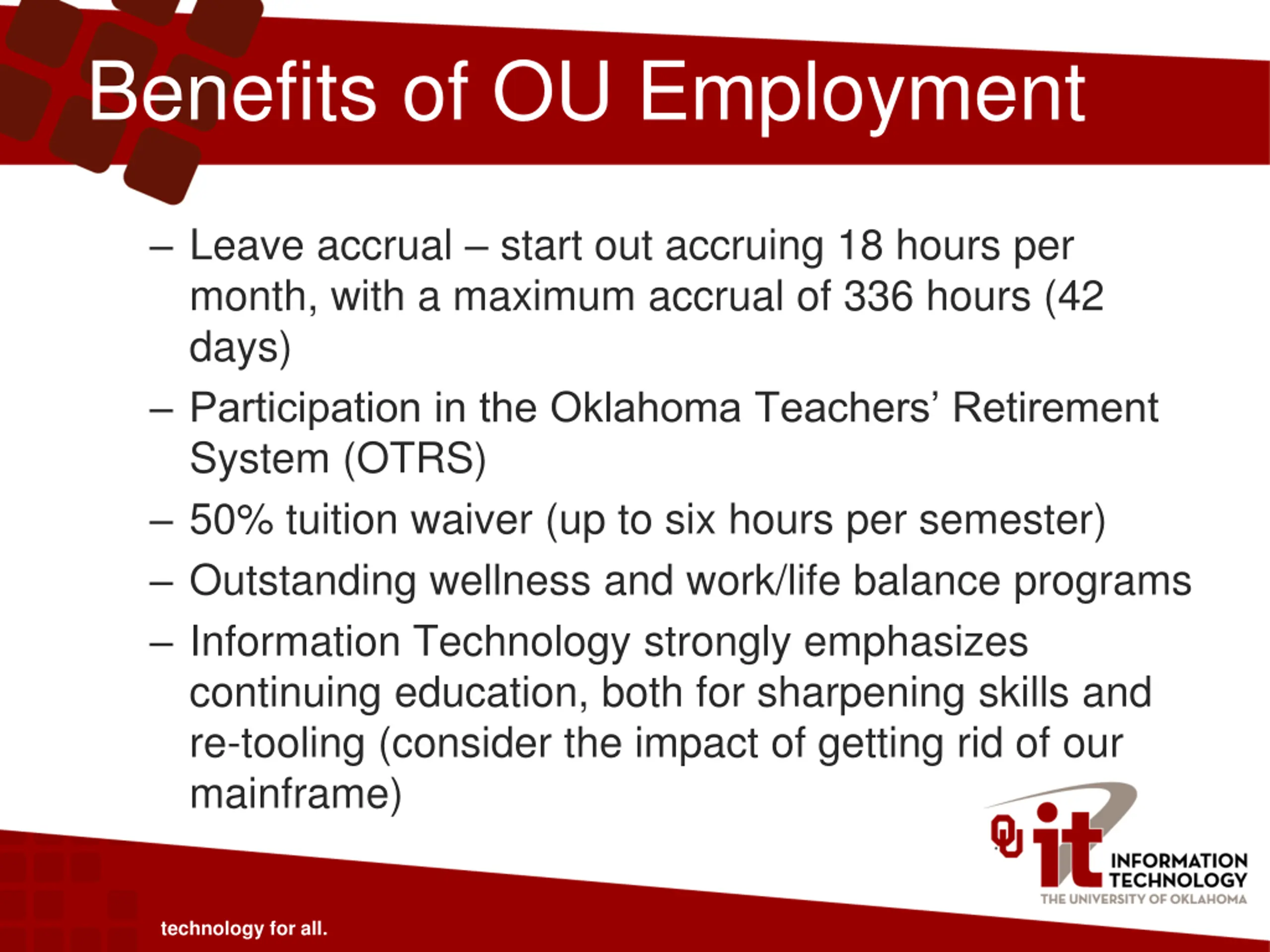 Benefits of OU Employment Leave accrual start out accruing 18 hours per month, with a maximum accrual of 336 hours (42 days) Participation in the Oklahoma Teachers Retirement System (OTRS) 50% tuition waiver (up to six hours per semester) Outstanding wellness and work/life balance programs Information Technology strongly emphasizes continuing education, both for sharpening skills and re-tooling (consider the impact of getting rid of our mainframe) technology for all.