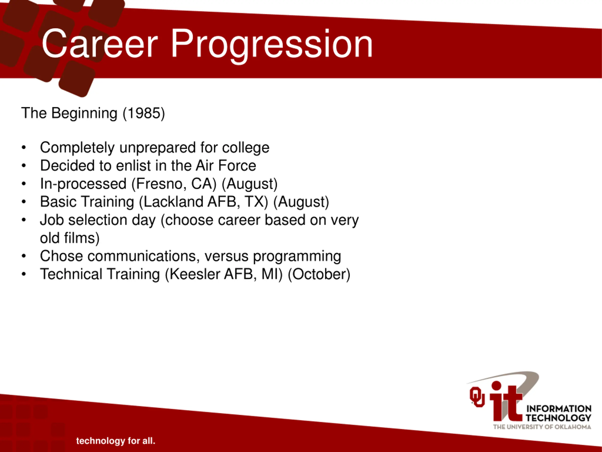 Career Progression The Beginning (1985) Completely unprepared for college Decided to enlist in the Air Force In-processed (Fresno, CA) (August) Basic Training (Lackland AFB, TX) (August) Job selection day (choose career based on very old films) Chose communications, versus programming Technical Training (Keesler AFB, MI) (October) technology for all.