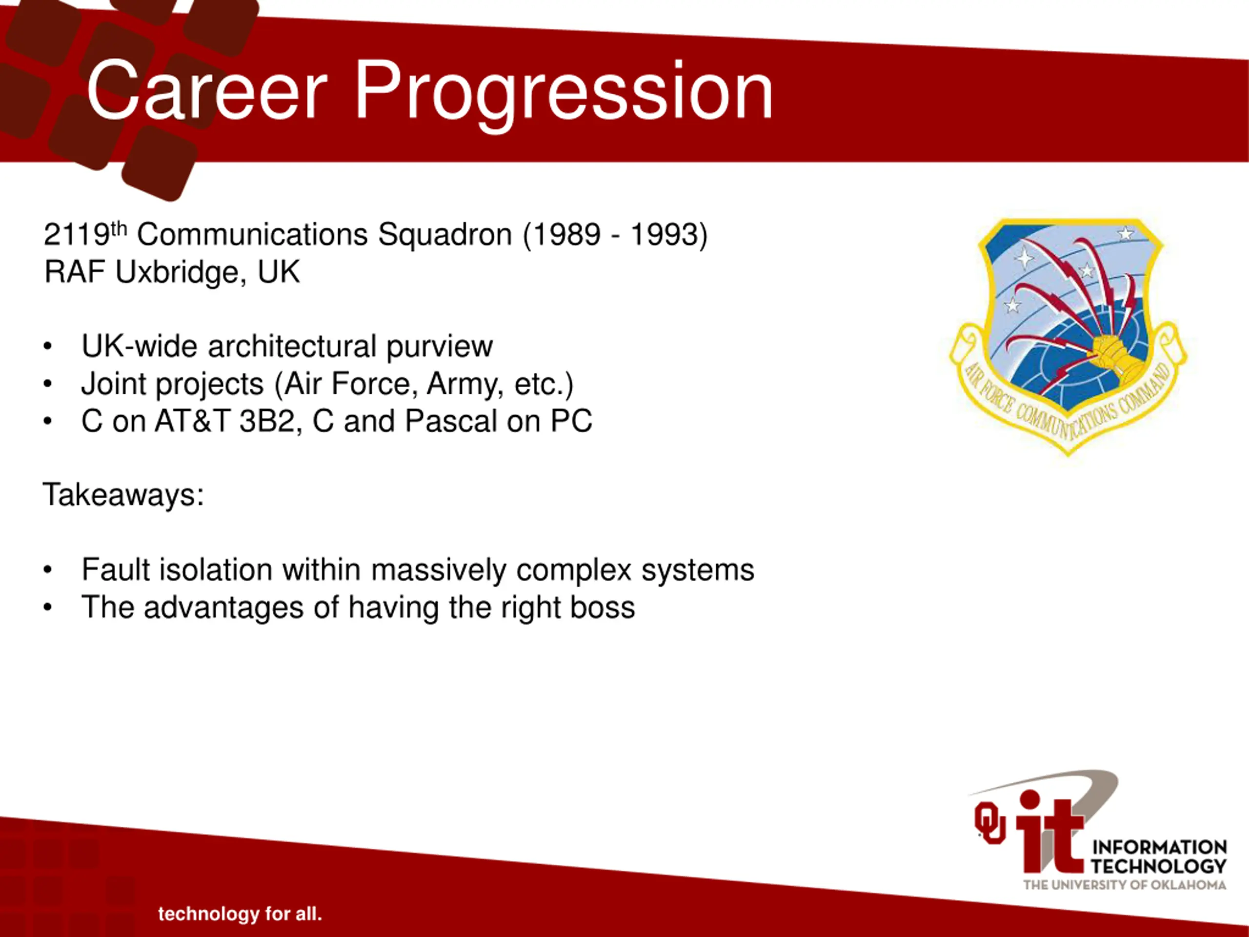 Career Progression 2119th Communications Squadron (1989 - 1993) RAF Uxbridge, UK UK-wide architectural purview Joint projects (Air Force, Army, etc.) C on AT&T 3B2, C and Pascal on PC Takeaways: Fault isolation within massively complex systems The advantages of having the right boss technology for all.