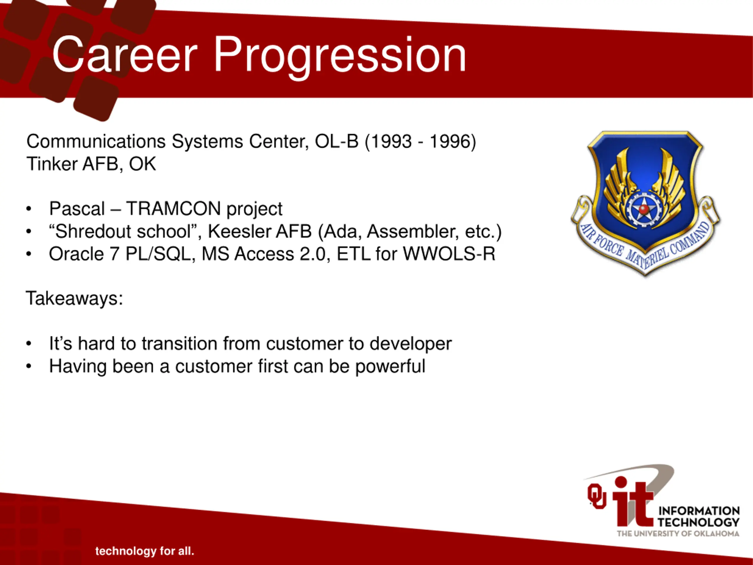 Career Progression Communications Systems Center, OL-B (1993 - 1996) Tinker AFB, OK Pascal TRAMCON project Shredout school , Keesler AFB (Ada, Assembler, etc.) Oracle 7 PL/SQL, MS Access 2.0, ETL for WWOLS-R Takeaways: It s hard to transition from customer to developer Having been a customer first can be powerful technology for all.