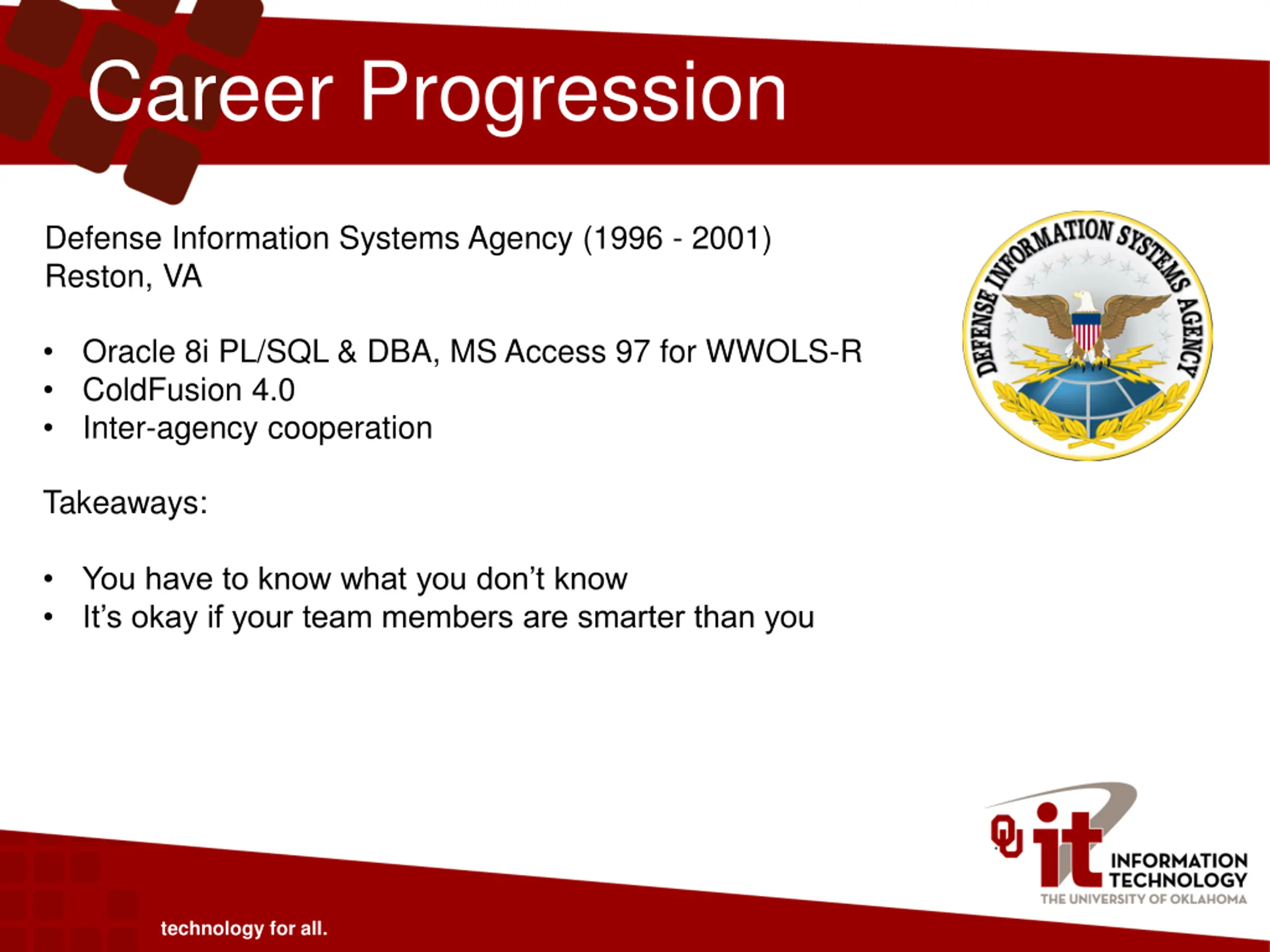 Career Progression Defense Information Systems Agency (1996 - 2001) Reston, VA Oracle 8i PL/SQL & DBA, MS Access 97 for WWOLS-R ColdFusion 4.0 Inter-agency cooperation Takeaways: You have to know what you don t know It s okay if your team members are smarter than you technology for all.