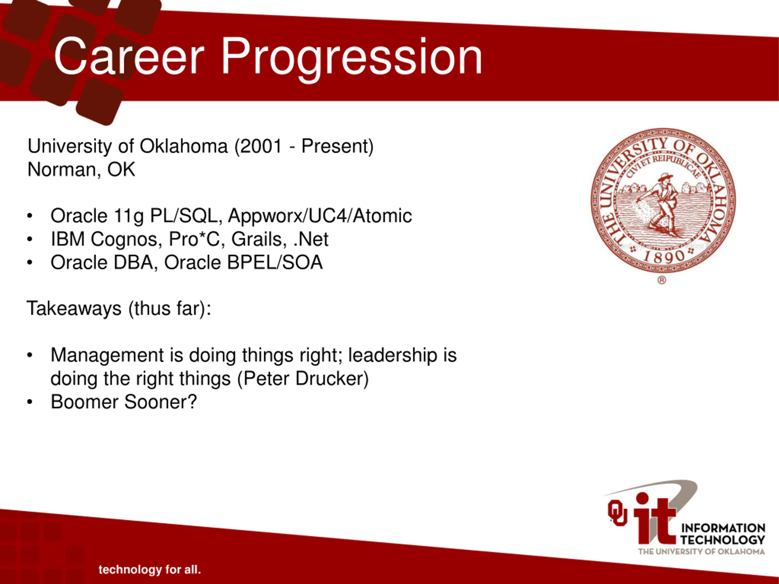 Career Progression University of Oklahoma (2001 - Present) Norman, OK Oracle 11g PL/SQL, Appworx/UC4/Atomic IBM Cognos, Pro*C, Grails, .Net Oracle DBA, Oracle BPEL/SOA Takeaways (thus far): Management is doing things right; leadership is doing the right things (Peter Drucker) Boomer Sooner? technology for all.