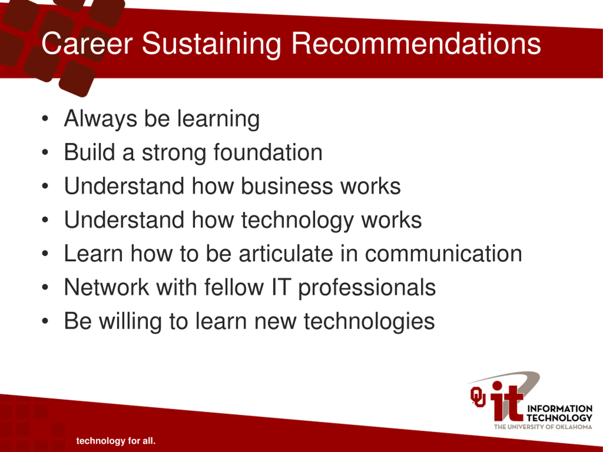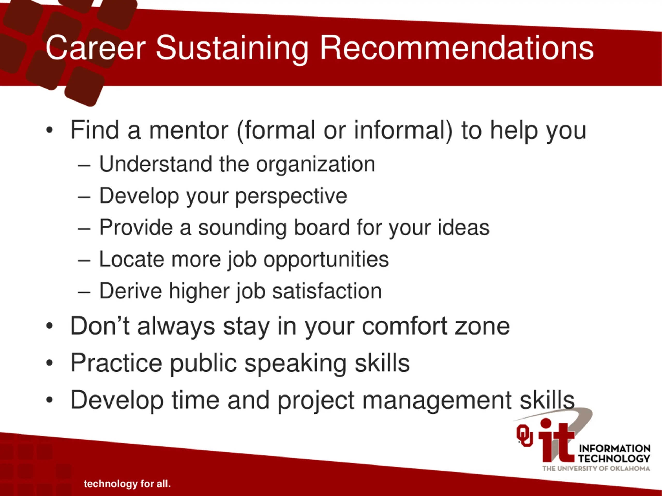 Career Sustaining Recommendations Find a mentor (formal or informal) to help you Understand the organization Develop your perspective Provide a sounding board for your ideas Locate more job opportunities Derive higher job satisfaction Don t always stay in your comfort zone Practice public speaking skills Develop time and project management skills technology for all.